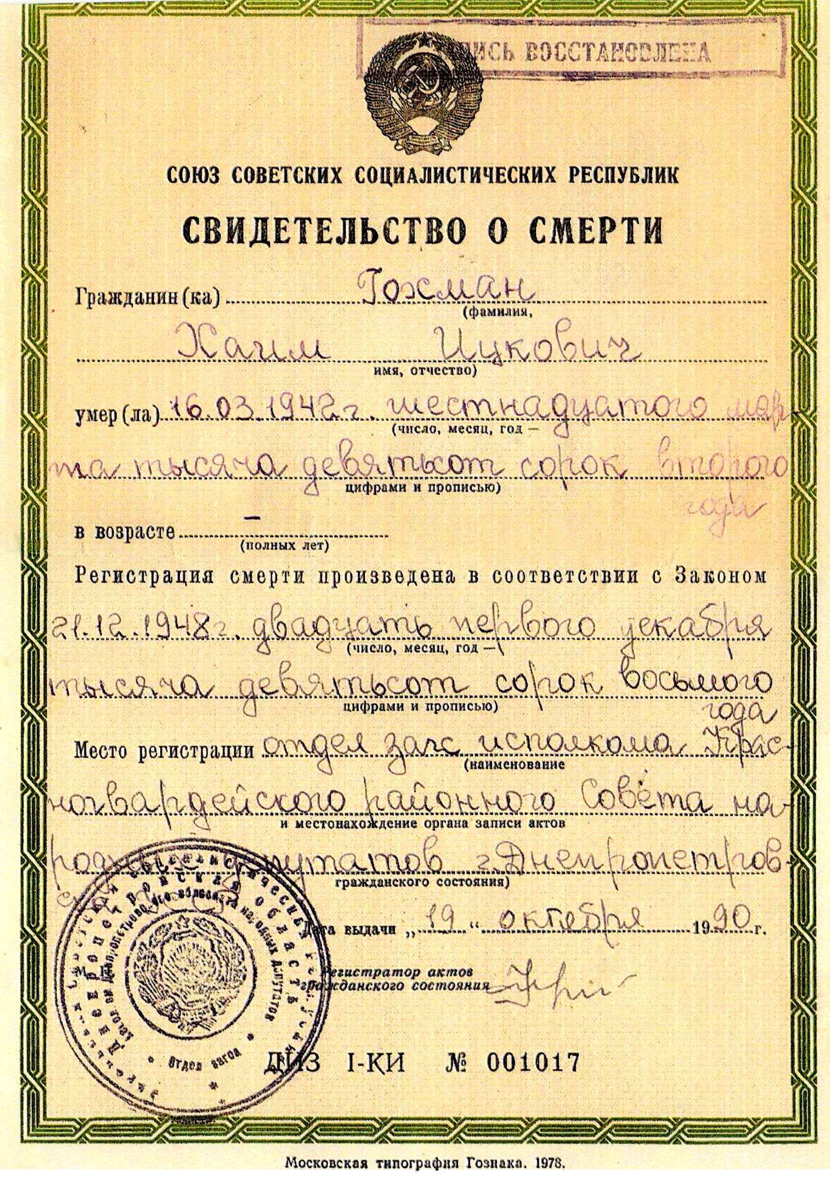 חיים נרצח בשואה. מקום המוות: Checherinskaya (Dnepropetrovsk) שבאוקראינה (ברה"מ) בשנת 16/03/1942.