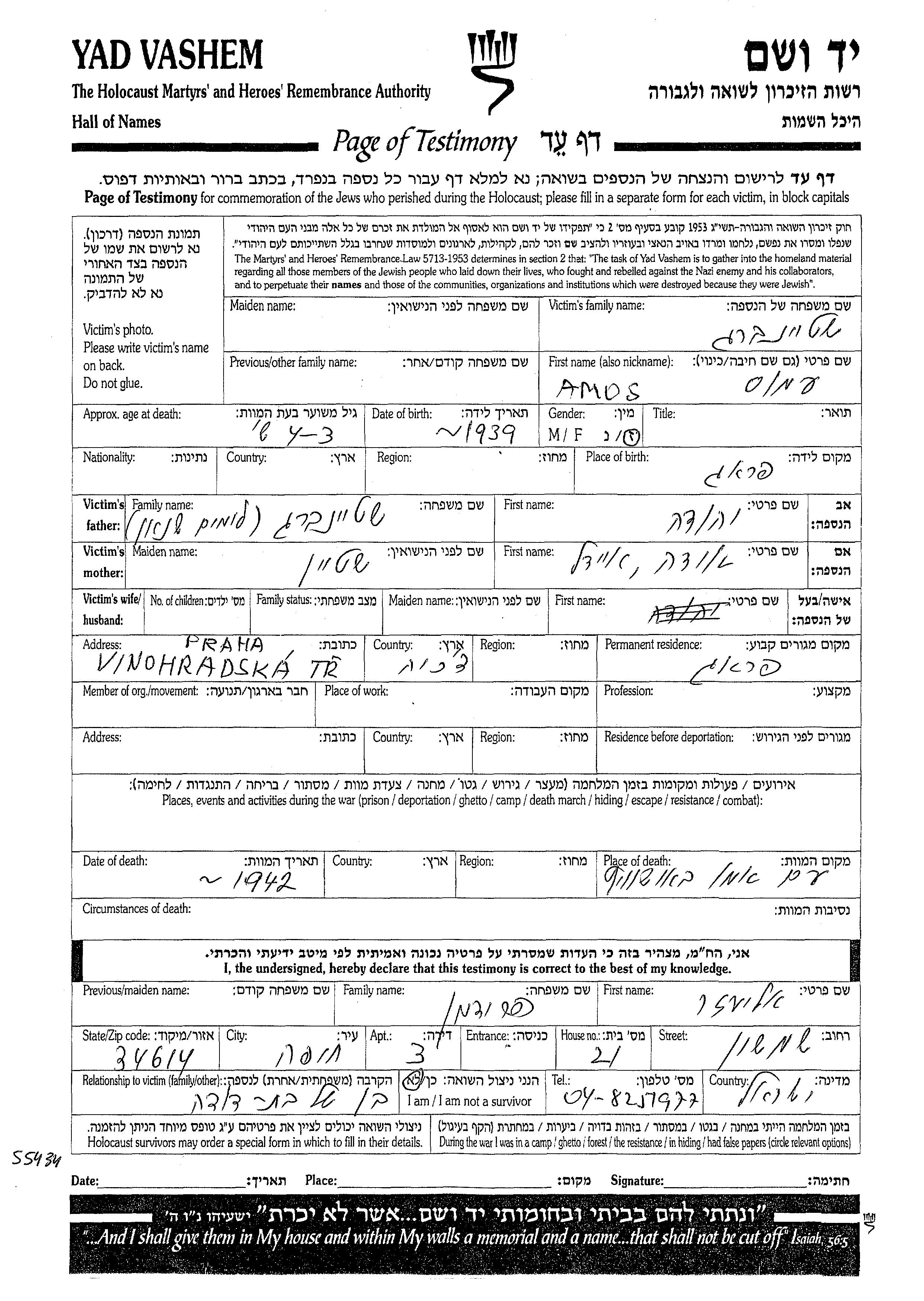 עמוס נרצח בשואה. מקום המוות: Auschwitz שבפולין בשנת 1942.