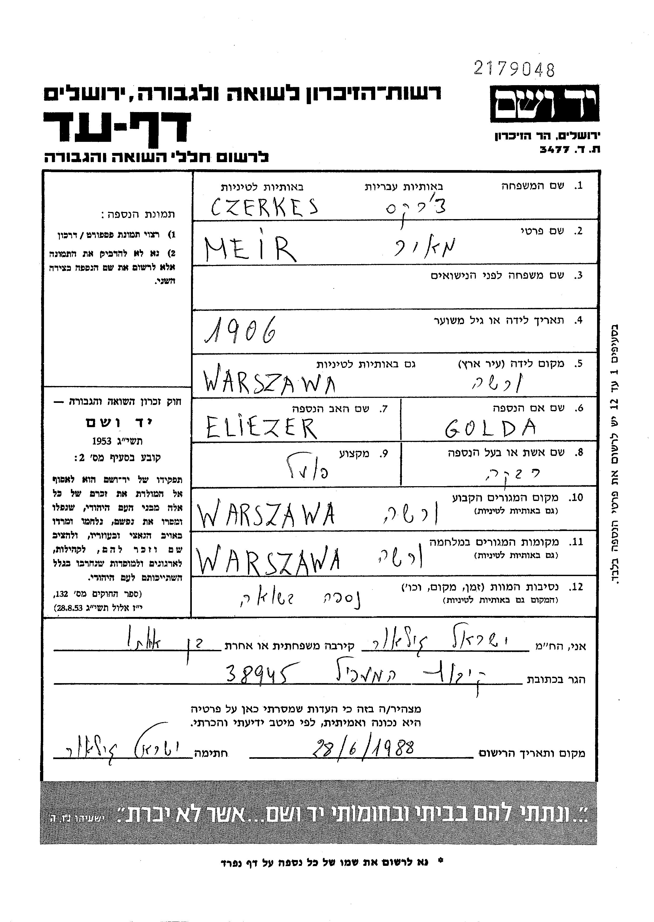 מאיר Czerkes נולד בWarszawa שבפולין בשנת 1906 לאליעזר וגולדה. הוא היה פועל ונשוי לרבקה. לפני מלחמת העולם השניה התגורר בWarszawa שבפולין. בזמן המלחמה הוא היה בWarszawa שבפולין.
