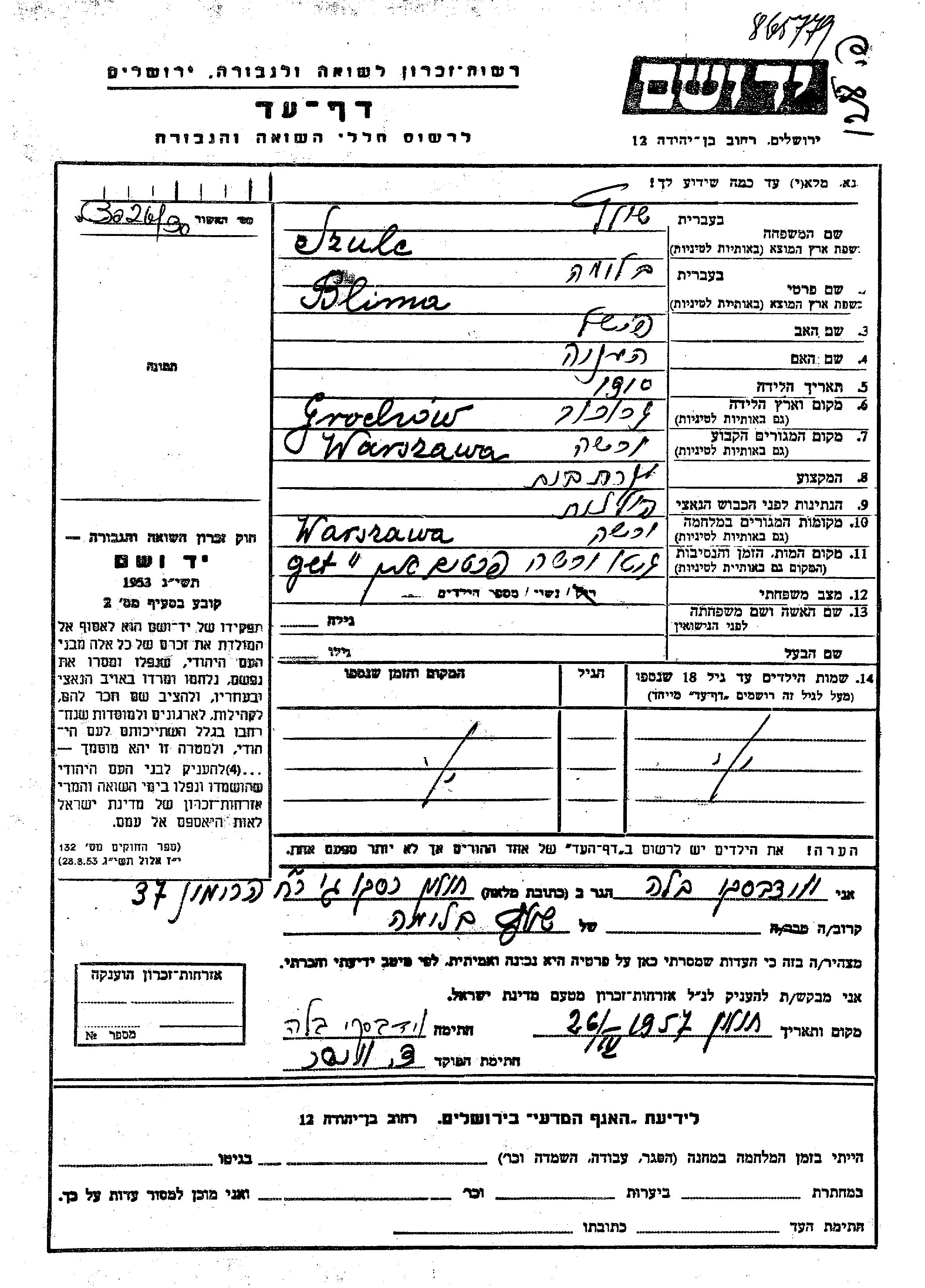 Blima Szulc נולדה בGrochow שבפולין בשנת 1910 לפישל והעניה. היא היתה עקרת בית ונשואה. לפני מלחמת העולם השניה התגוררה בWarschau שבפולין. בזמן המלחמה היא היתה בWarschau שבפולין. היא נרצחה בשואה. מקום המוות: Warschau שבפולין.