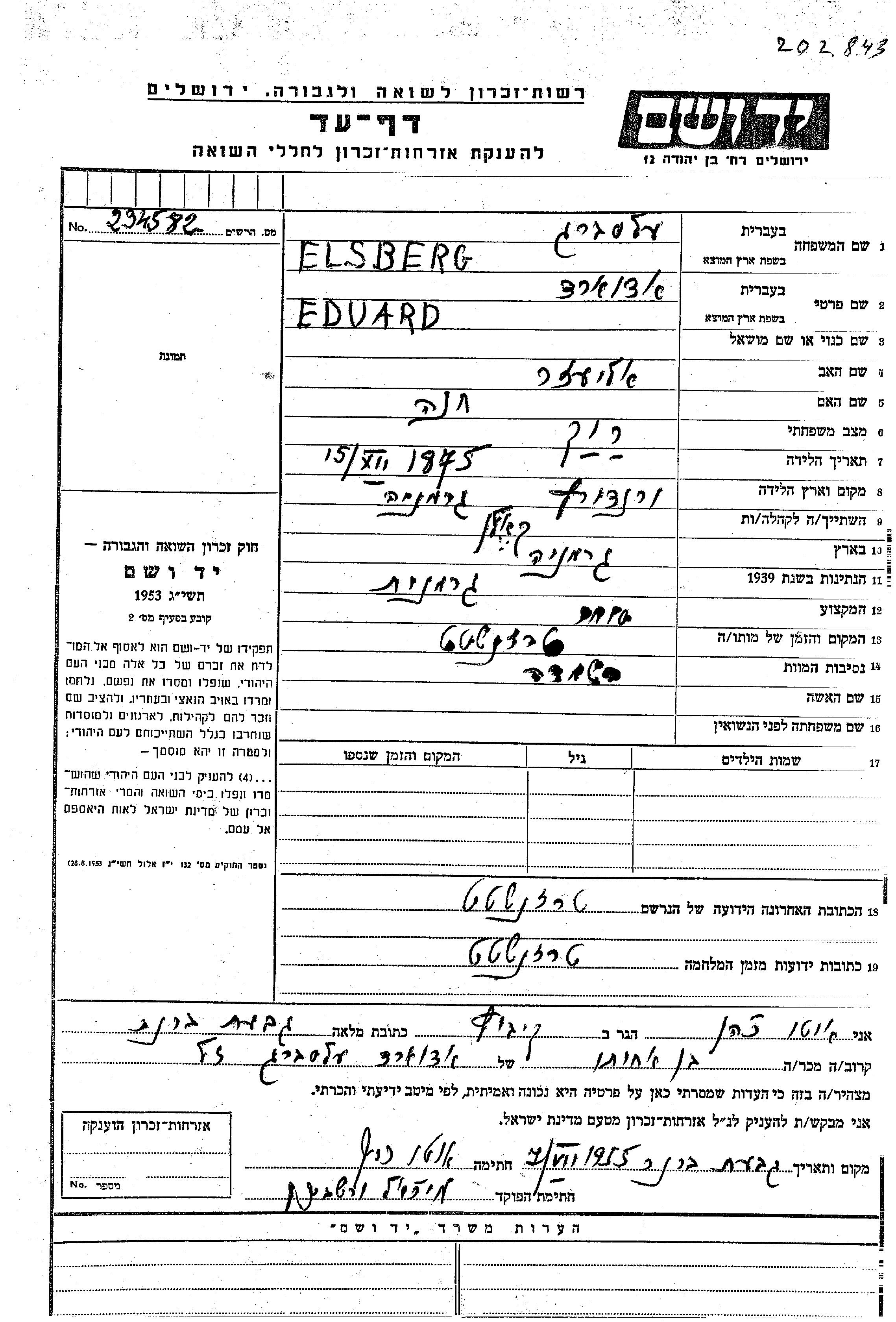 אדוארד נרצח בשואה. מקום המוות: Theresienstadt שבצ'כוסלובקיה.