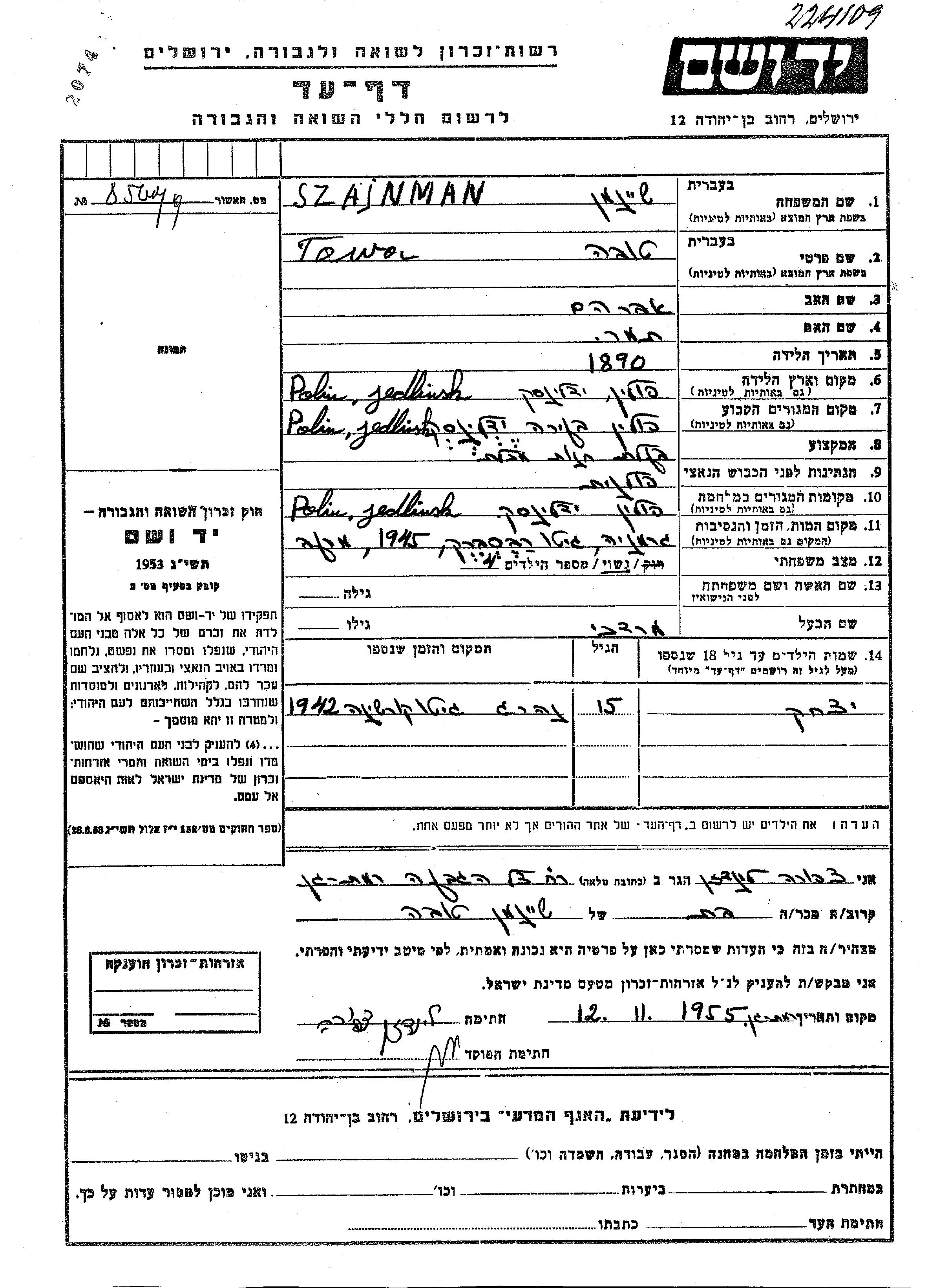 Towa Szajnman נולדה בJedlinsk שבפולין בשנת 1890 לאברהם ותמר. היא היתה בעלת חנות מכולת ונשואה למרדכי. לפני מלחמת העולם השניה התגוררה בJedlinsk שבפולין. בזמן המלחמה היא היתה בJedlinsk שבפולין. היא נרצחה בשואה. מקום המוות: לא ידוע בשנת 1945.