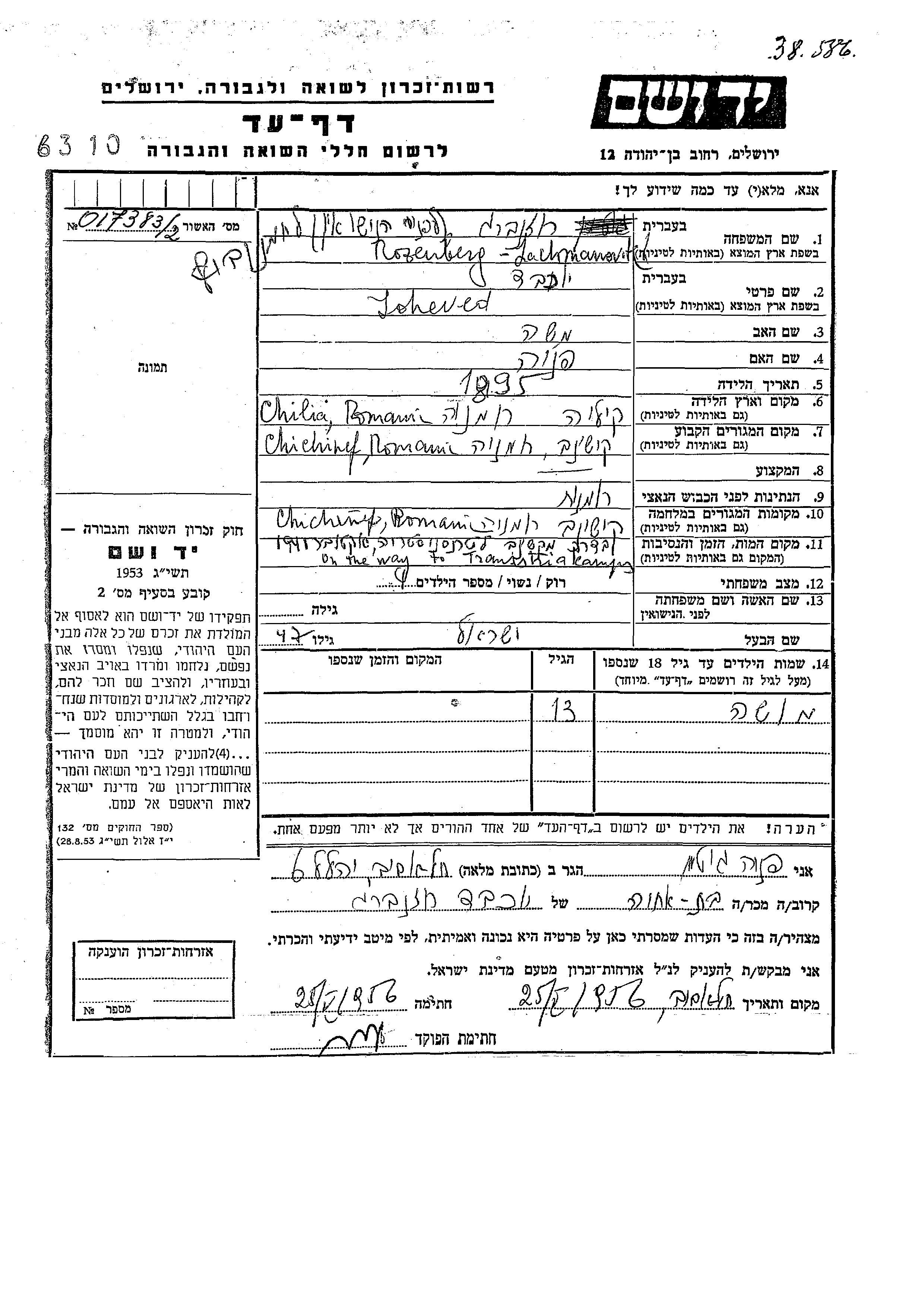 Joheved רוזנברג לבית Lachmanovitch נולדה בChilia שברומניה בשנת 1895 למשה ופניה. היא היתה נשואה לישראל. לפני מלחמת העולם השניה התגוררה בKishinev שברומניה. בזמן המלחמה היא היתה בKishinev שברומניה.