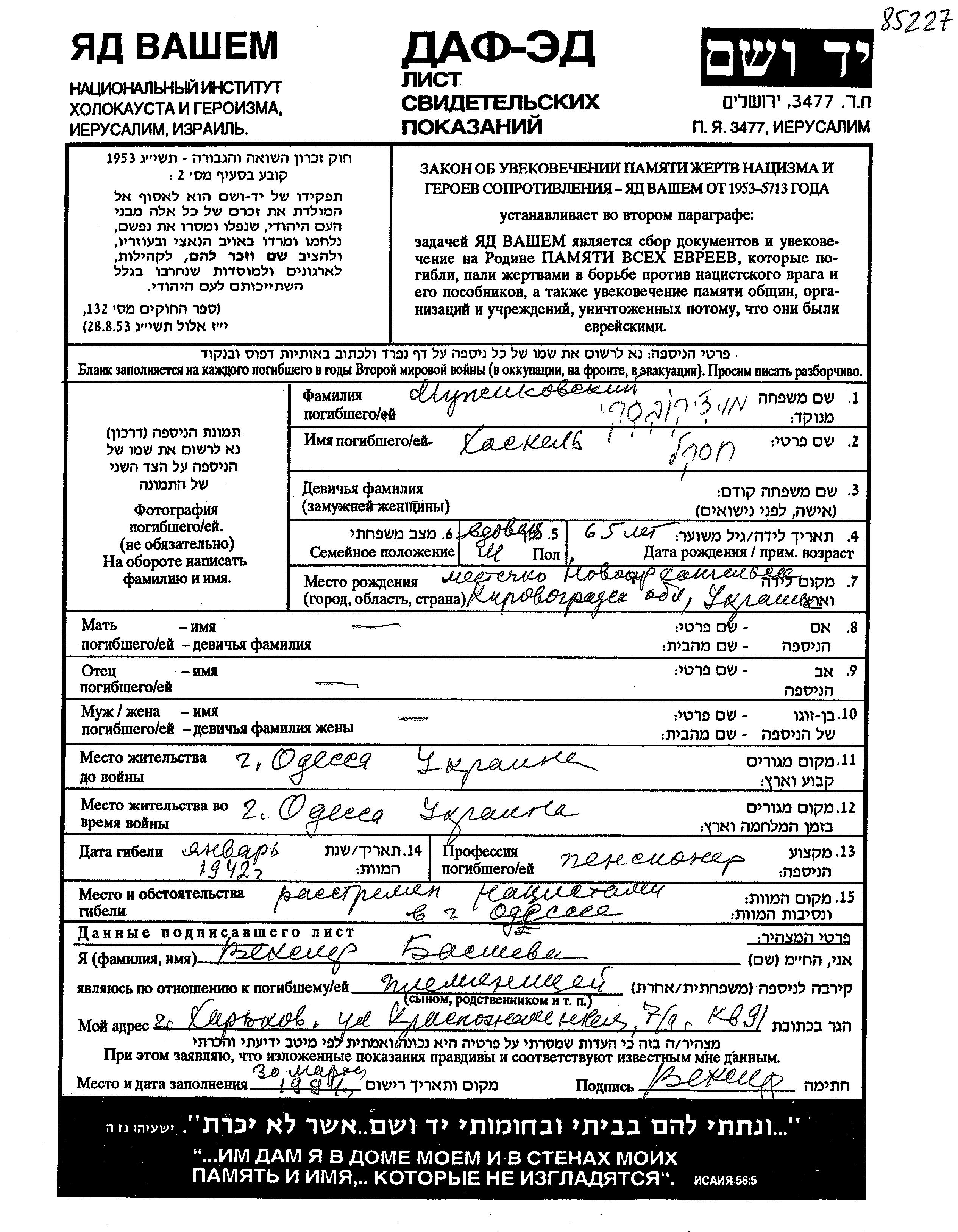 חסקל מוזיקובסקי נולד בNovoarkhangelsk שבאוקראינה (ברה"מ) בשנת 1877. הוא היה גימלאי ואלמן. לפני מלחמת העולם השניה התגורר בOdessa שבאוקראינה (ברה"מ). בזמן המלחמה הוא היה בOdessa שבאוקראינה (ברה"מ). חסקל נרצח בשואה. מקום המוות: Odessa שבאוקראינה (ברה"מ) בשנת 1942.