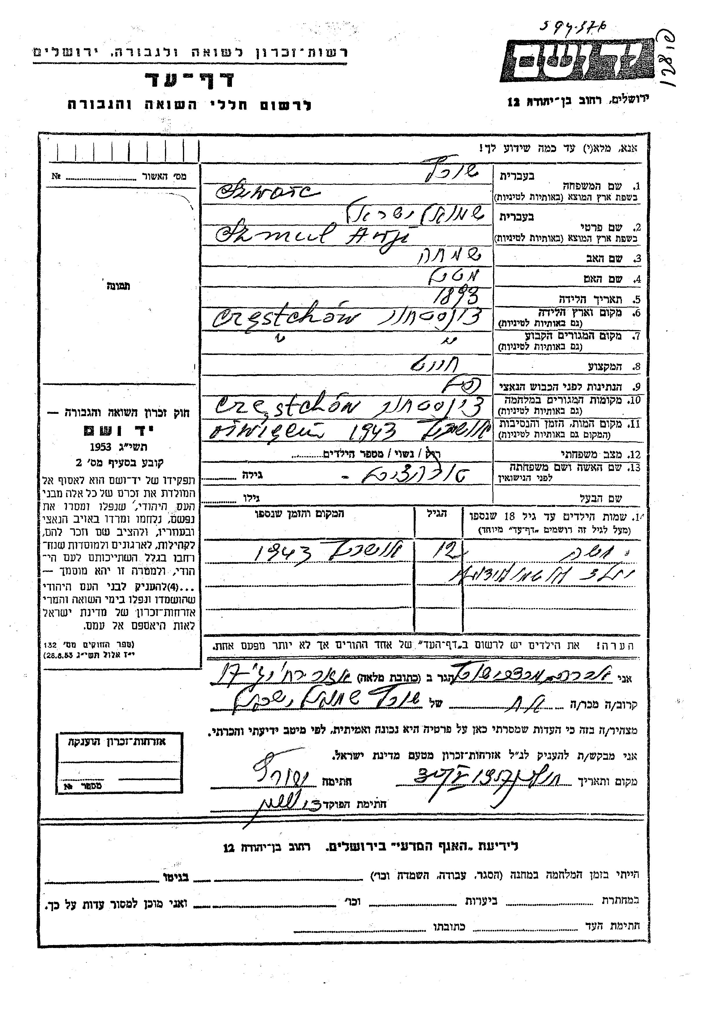 Szmul Arji ישראל Szwarc נולד בCzestochowa שבפולין בשנת 1893 לשמחה ומטיל. הוא היה חייט ונשוי לטובה צירל. לפני מלחמת העולם השניה התגורר בCzestochow שבפולין. בזמן המלחמה הוא היה בCzestochow שבפולין. הוא נרצח בשואה. מקום המוות: Auschwitz שבפולין בשנת 1943.