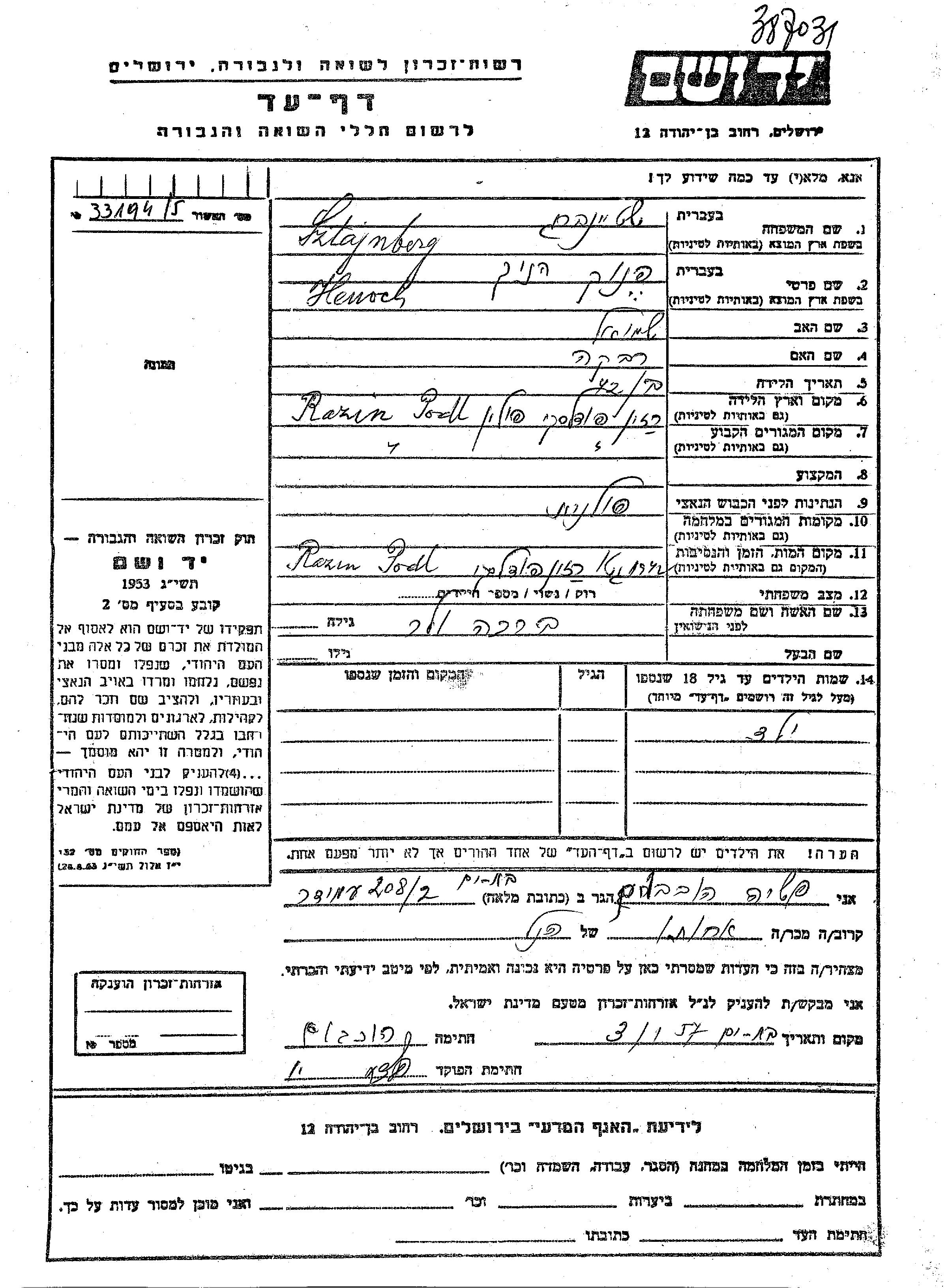 חיפוש שם מוסר דף העד. חיפוש לפי כל שם פרטי, כולל כינוי או שם חיבה