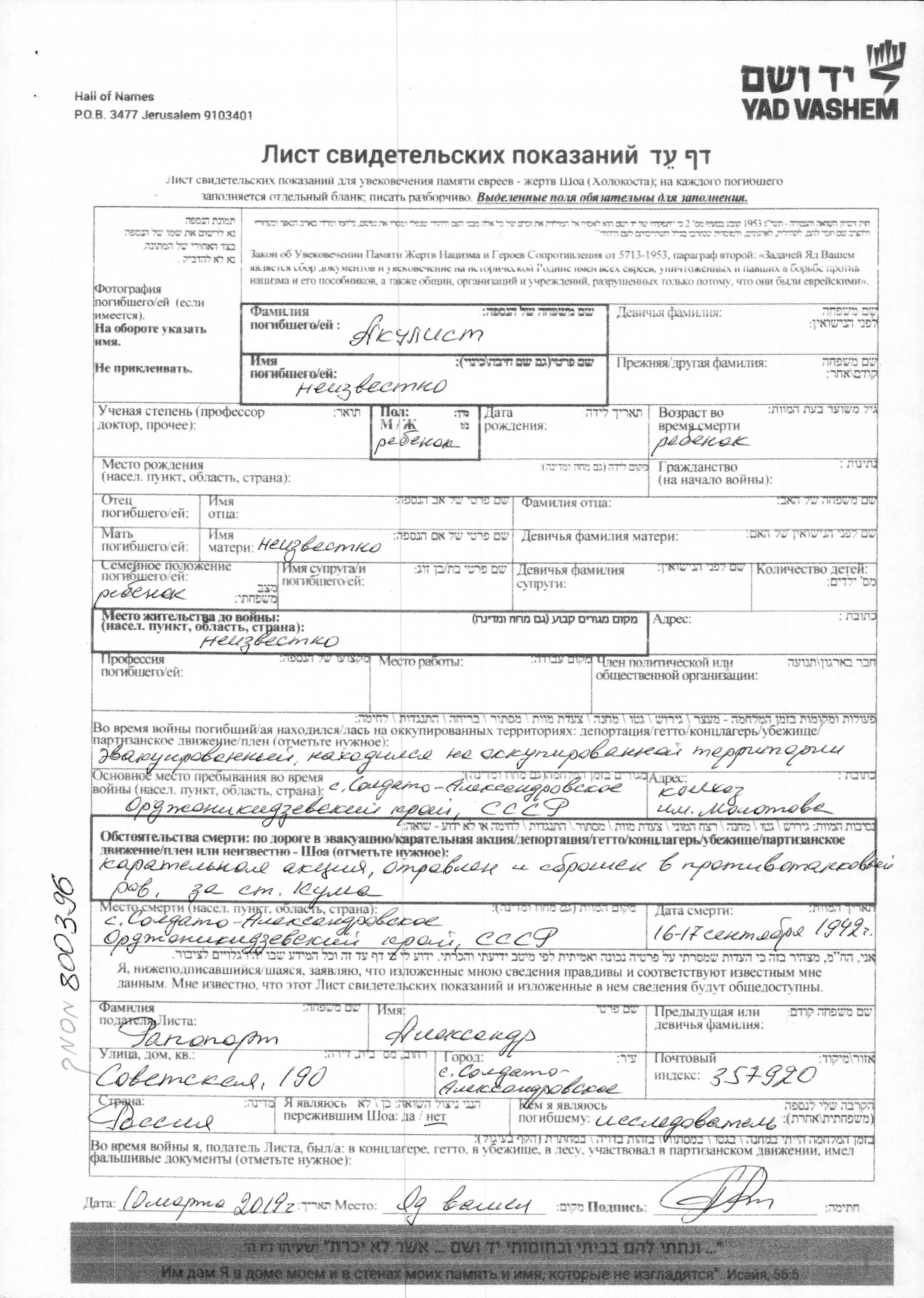 נרצח/ה בשואה. מקום המוות: Soldato Aleksandrovskoye שברוסיה (ברה"מ) בשנת 16/09/1942.