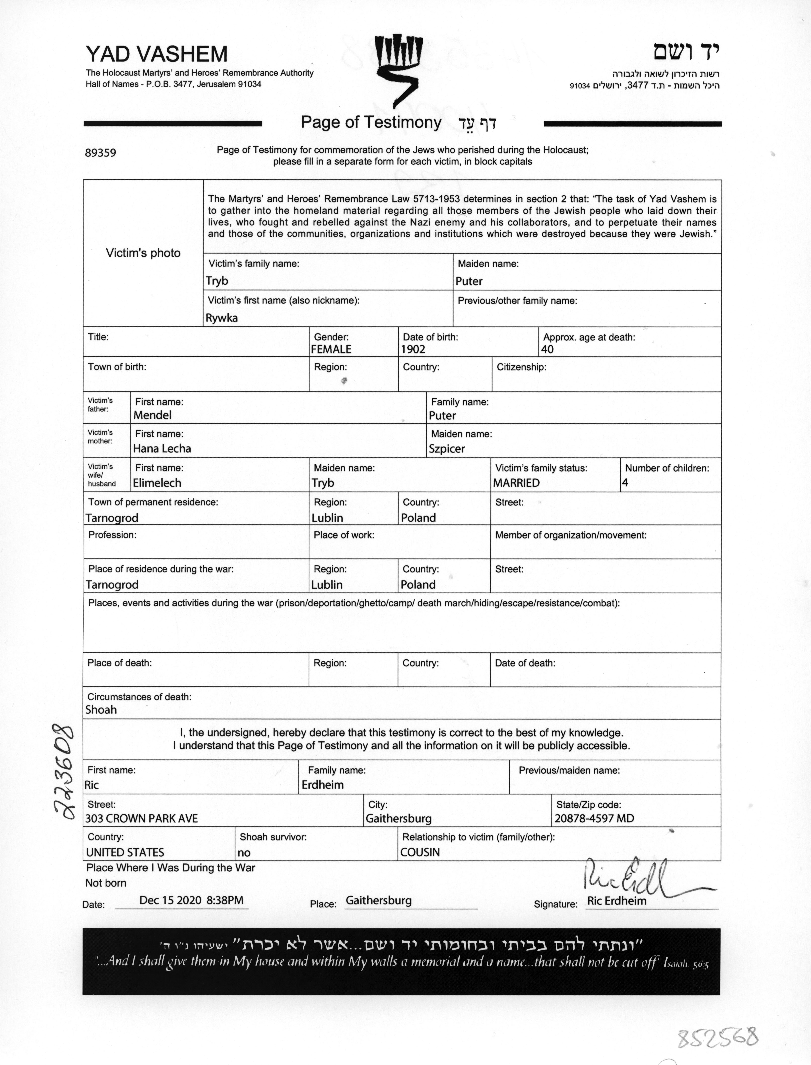 Rikel Rywka טריפ לבית Tryb נולדה בTarnogrod שבפולין. היא היתה עקרת בית. לפני מלחמת העולם השניה התגוררה בTarnogrod שבפולין.