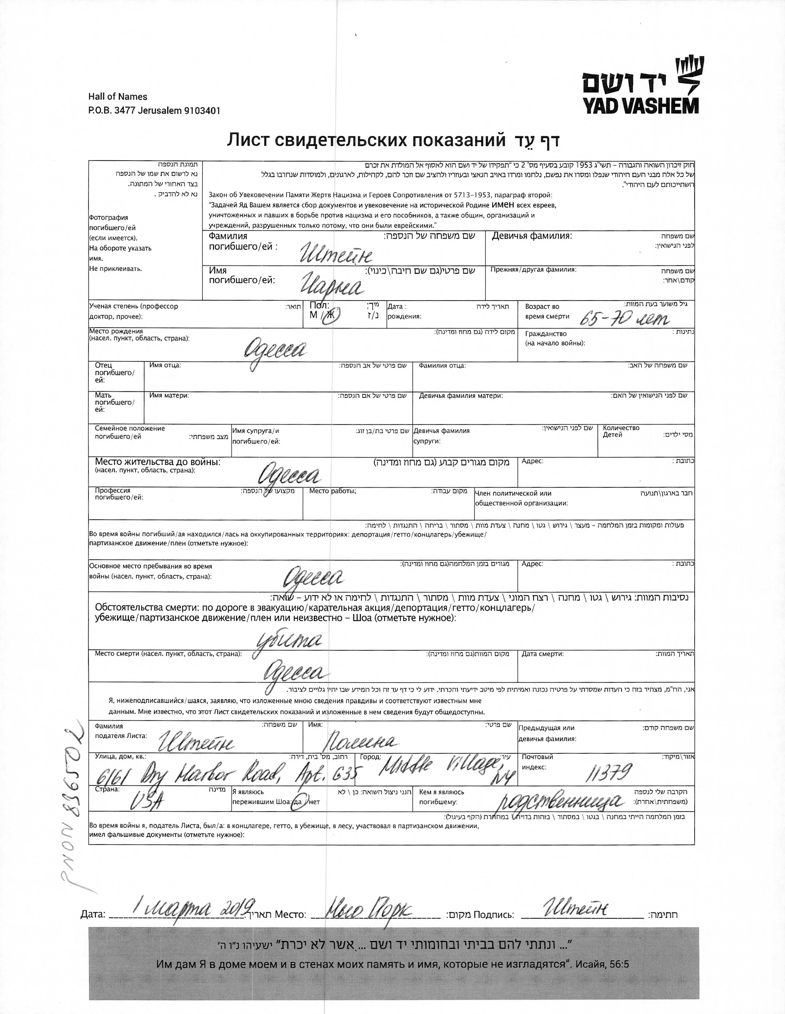 צ'רנה נרצח/ה בשואה. מקום המוות: Odessa שבאוקראינה (ברה"מ).