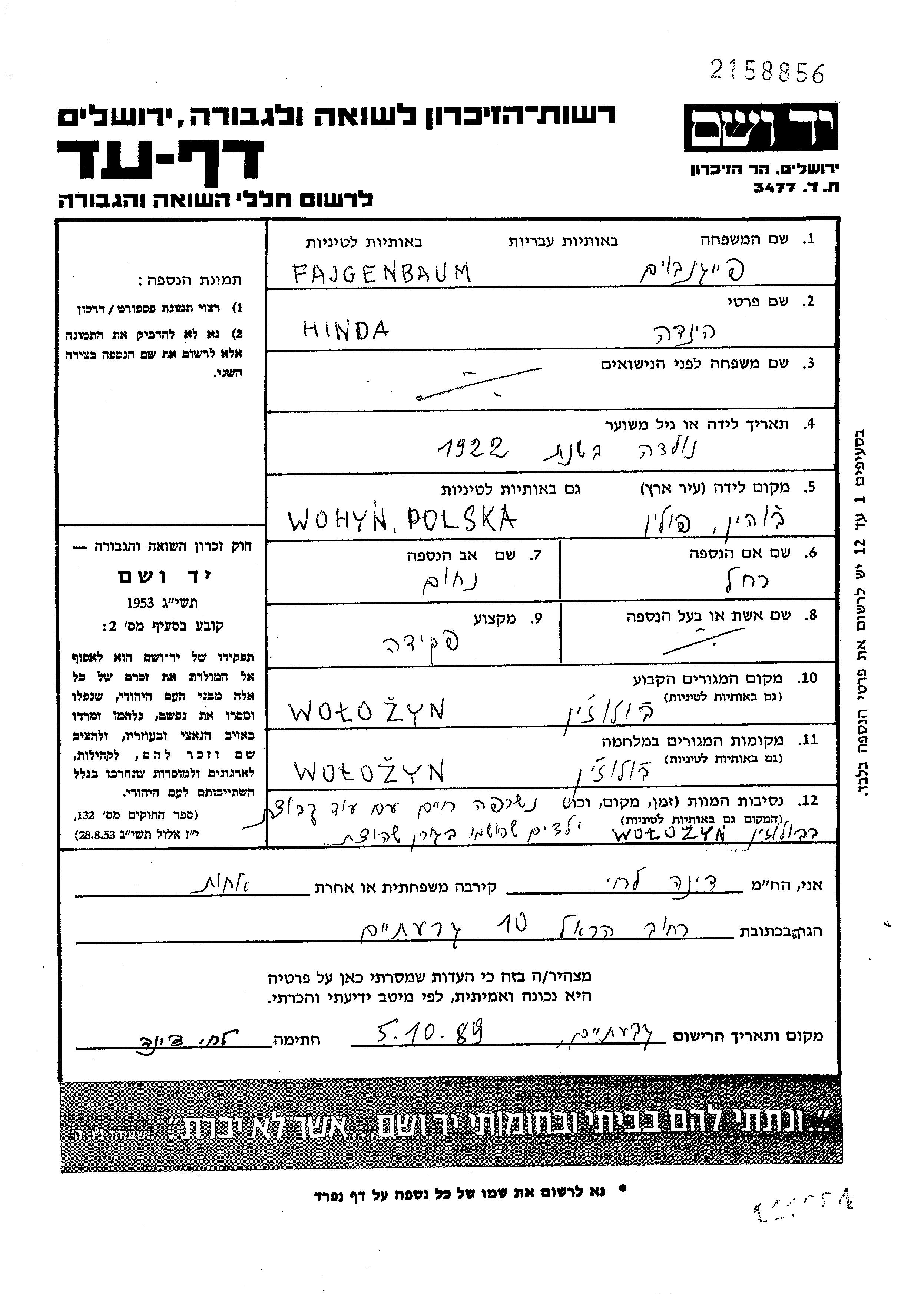 הינדה Faigenbaum נולדה בWohyn שבפולין בשנת 1922. היא היתה פקידה. לפני מלחמת העולם השניה התגוררה בWolozyn שבפולין.