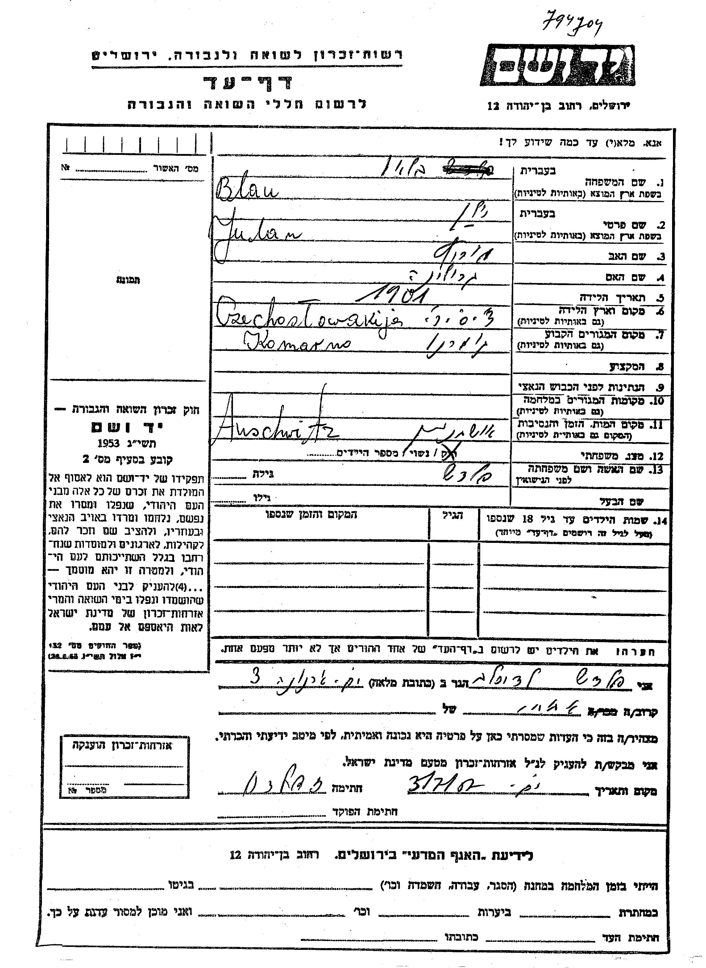 Julan בלאו לבית Foldes נולדה בKomarno שבצ'כוסלובקיה בשנת 1901. לפני מלחמת העולם השניה התגוררה בKomarno שבצ'כוסלובקיה.