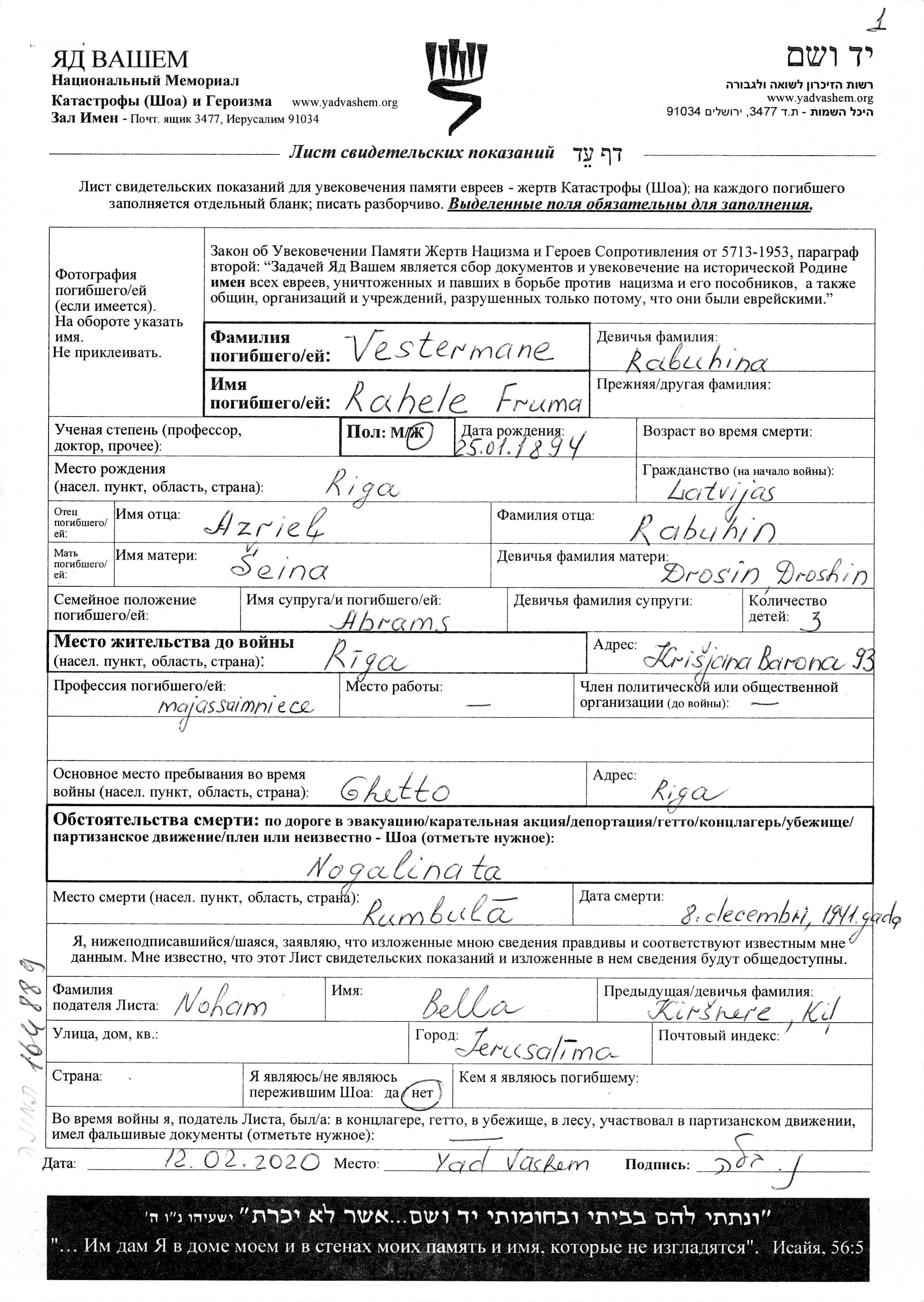 Rahele Fruma Vestermane לבית Rabuhina נולדה בRiga שבלטביה בשנת 1894. היא היתה עקרת בית. לפני מלחמת העולם השניה התגוררה בRiga שבלטביה.