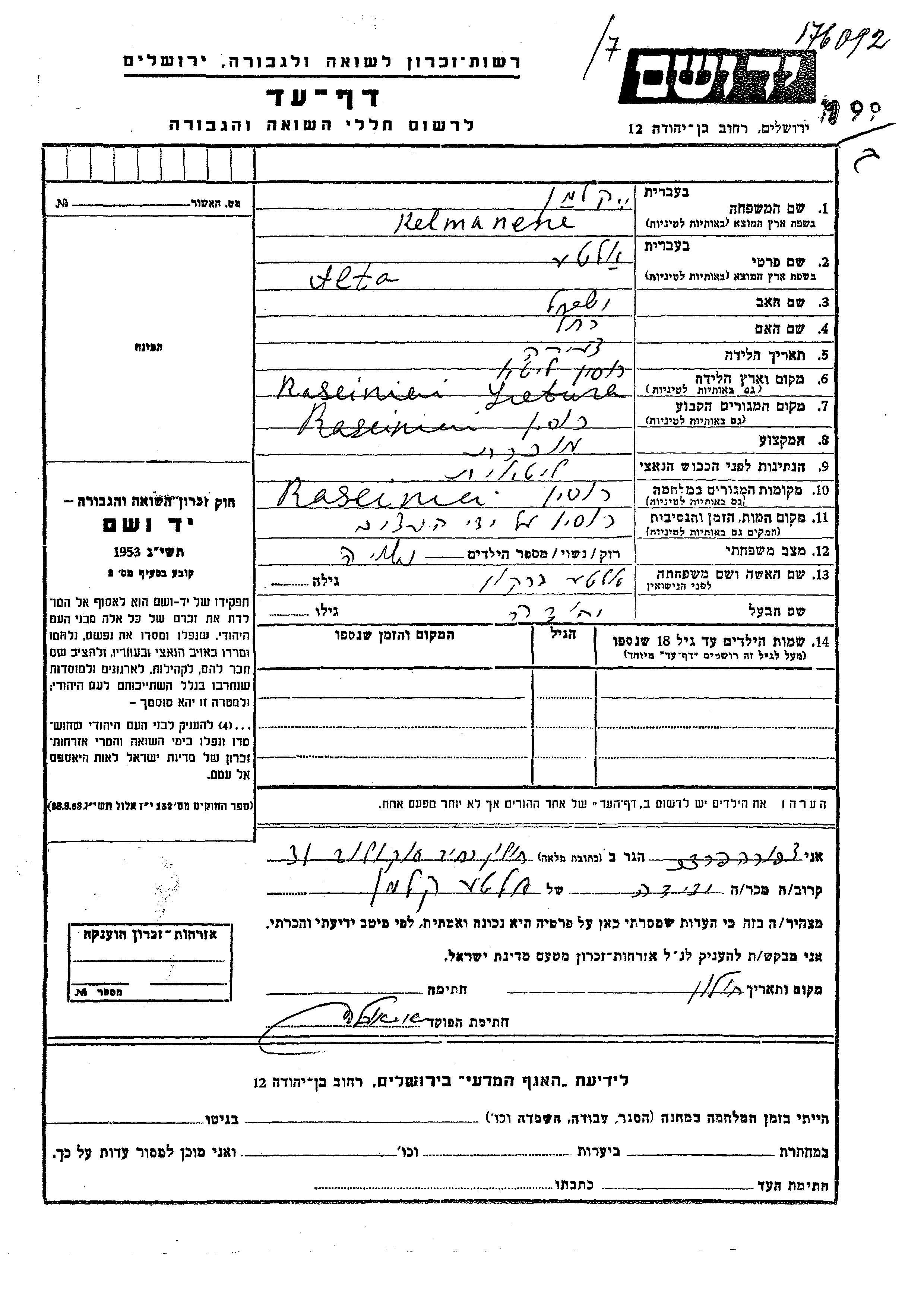 Alta Kelmanene קלמן לבית ברקון נולדה בRaseiniai שבליטא לישראל ורחל. היא היתה מוכרת ונשואה ליהודה. לפני מלחמת העולם השניה התגוררה בRaseiniai שבליטא. בזמן המלחמה היא היתה בRaseiniai שבליטא.