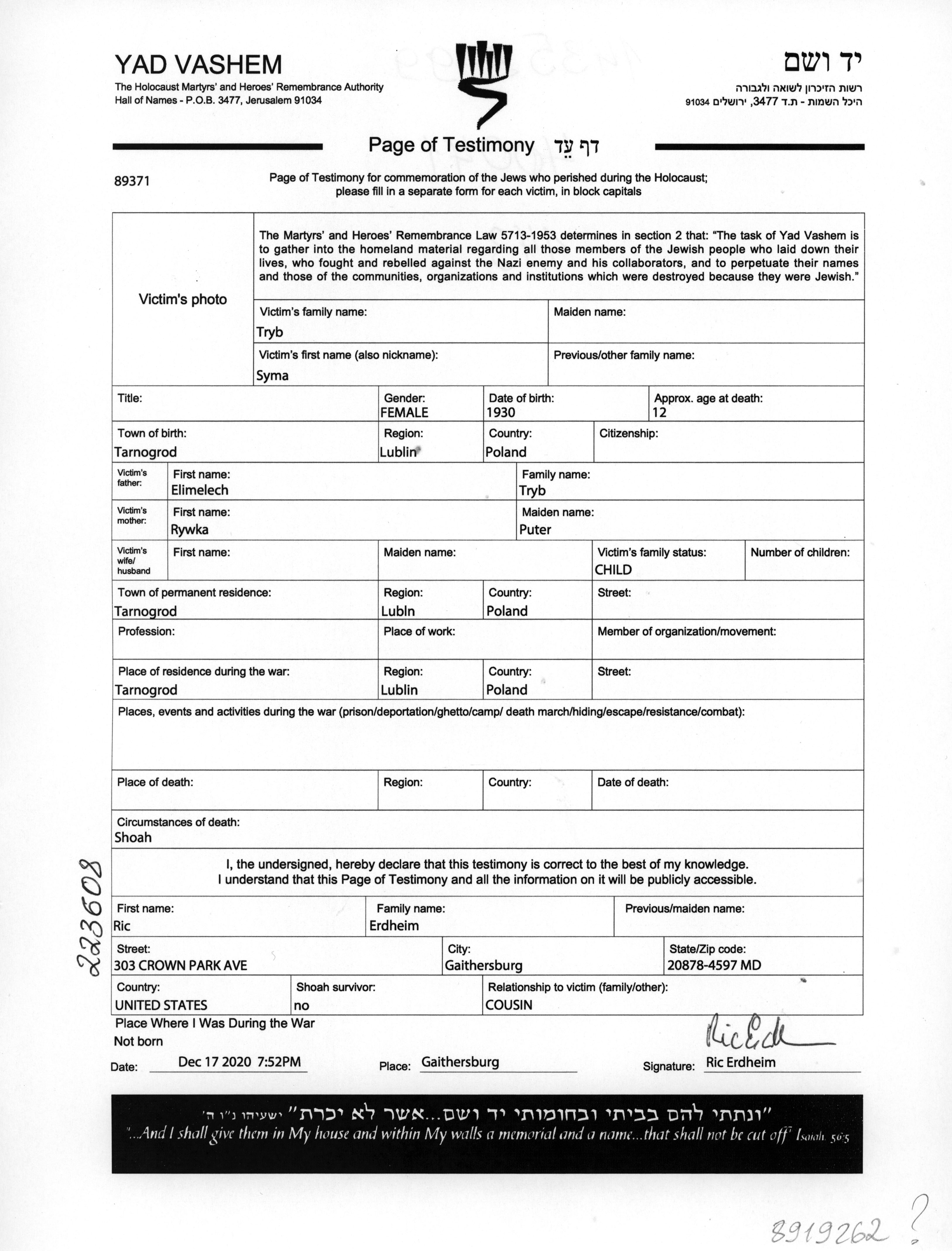 Syma Tryb נולדה בTarnogrod שבפולין בשנת 1930 לElimelech וRywka לבית פוטר. היא היתה ילדה. לפני מלחמת העולם השניה התגוררה בTarnogrod שבפולין. בזמן המלחמה היא היתה בTarnogrod שבפולין. היא נרצחה בשואה.
