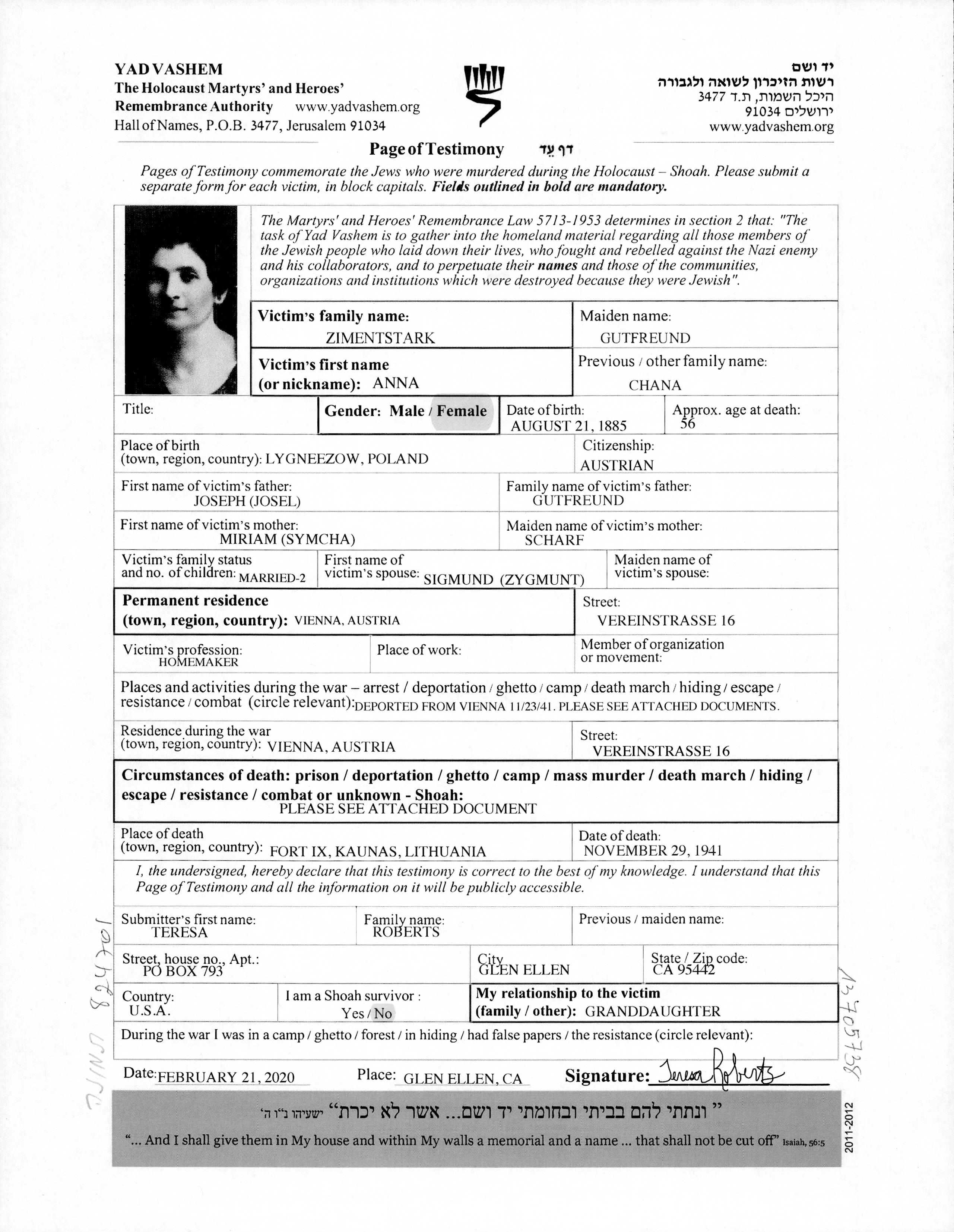 אנה Zimentstark לבית Gutfreund נולדה בLegniszewo שבגרמניה בשנת 1885. היא היתה עקרת בית. לפני מלחמת העולם השניה התגוררה בVienna שבאוסטריה.