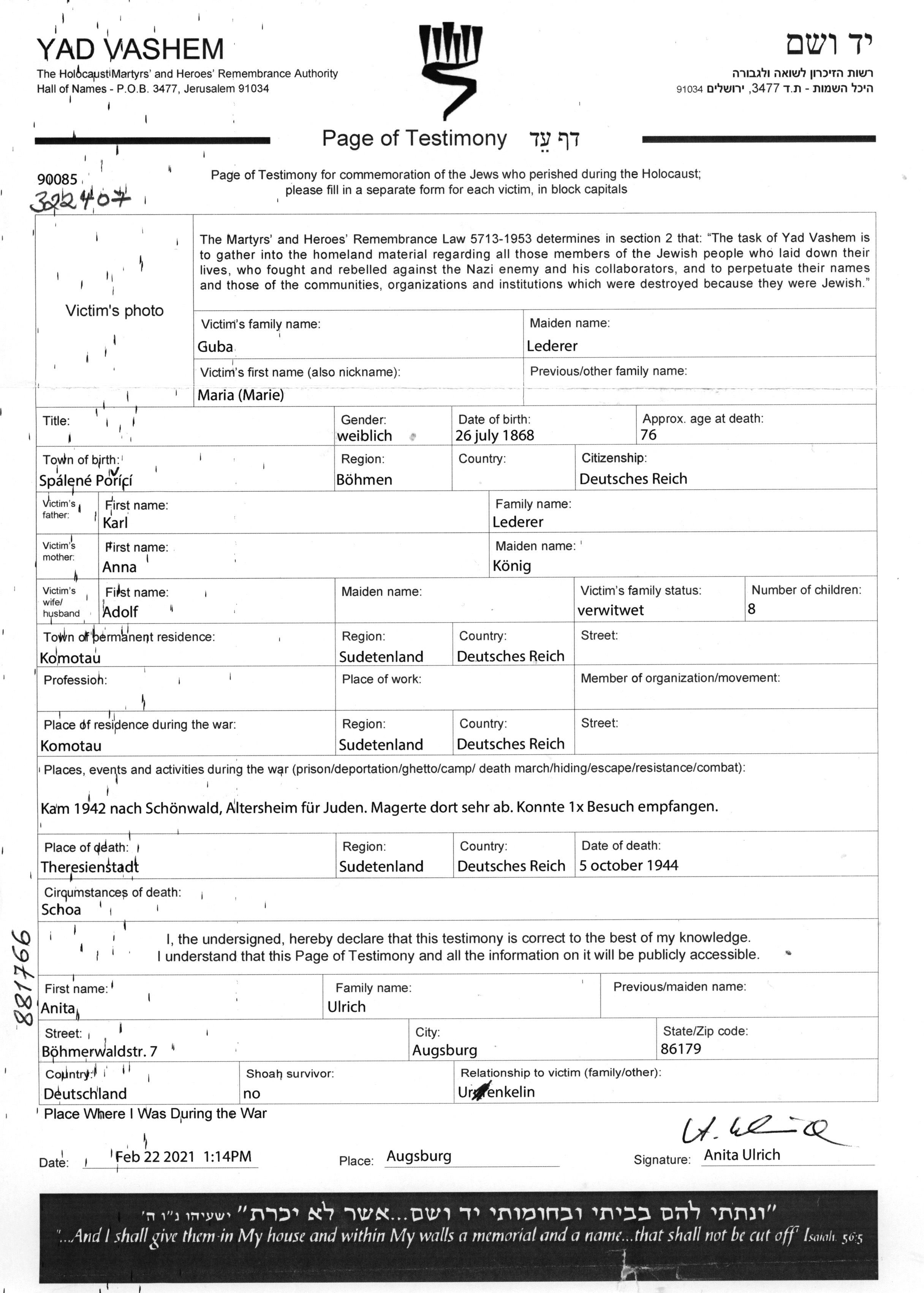 Maria Guba לבית Lederer נולדה בSpalene Porici שבצ'כוסלובקיה בשנת 1868. לפני מלחמת העולם השניה התגוררה בKomotau שבצ'כוסלובקיה.