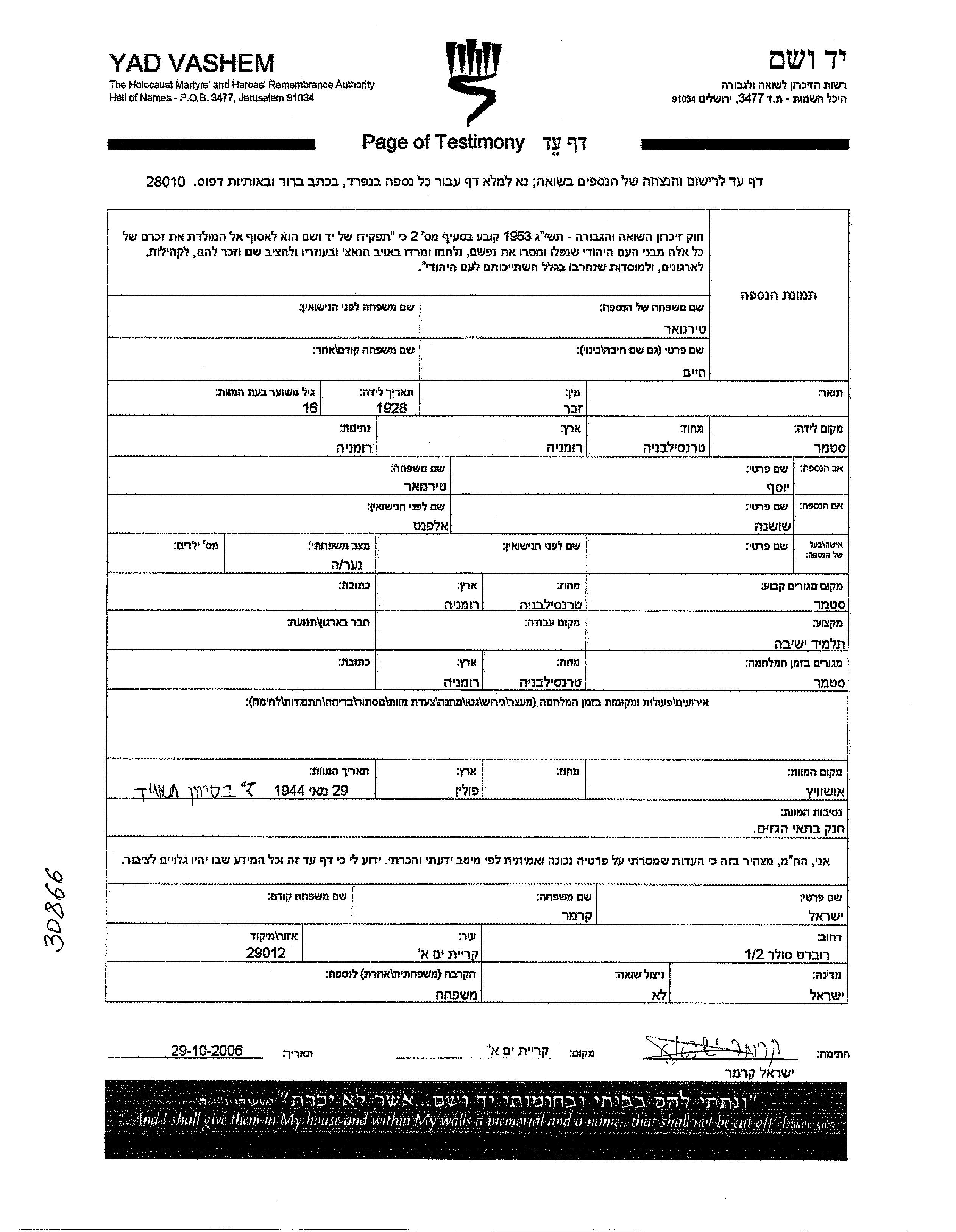 חיים נרצח בשואה. מקום המוות: Auschwitz שבפולין בשנת 29/05/1944.