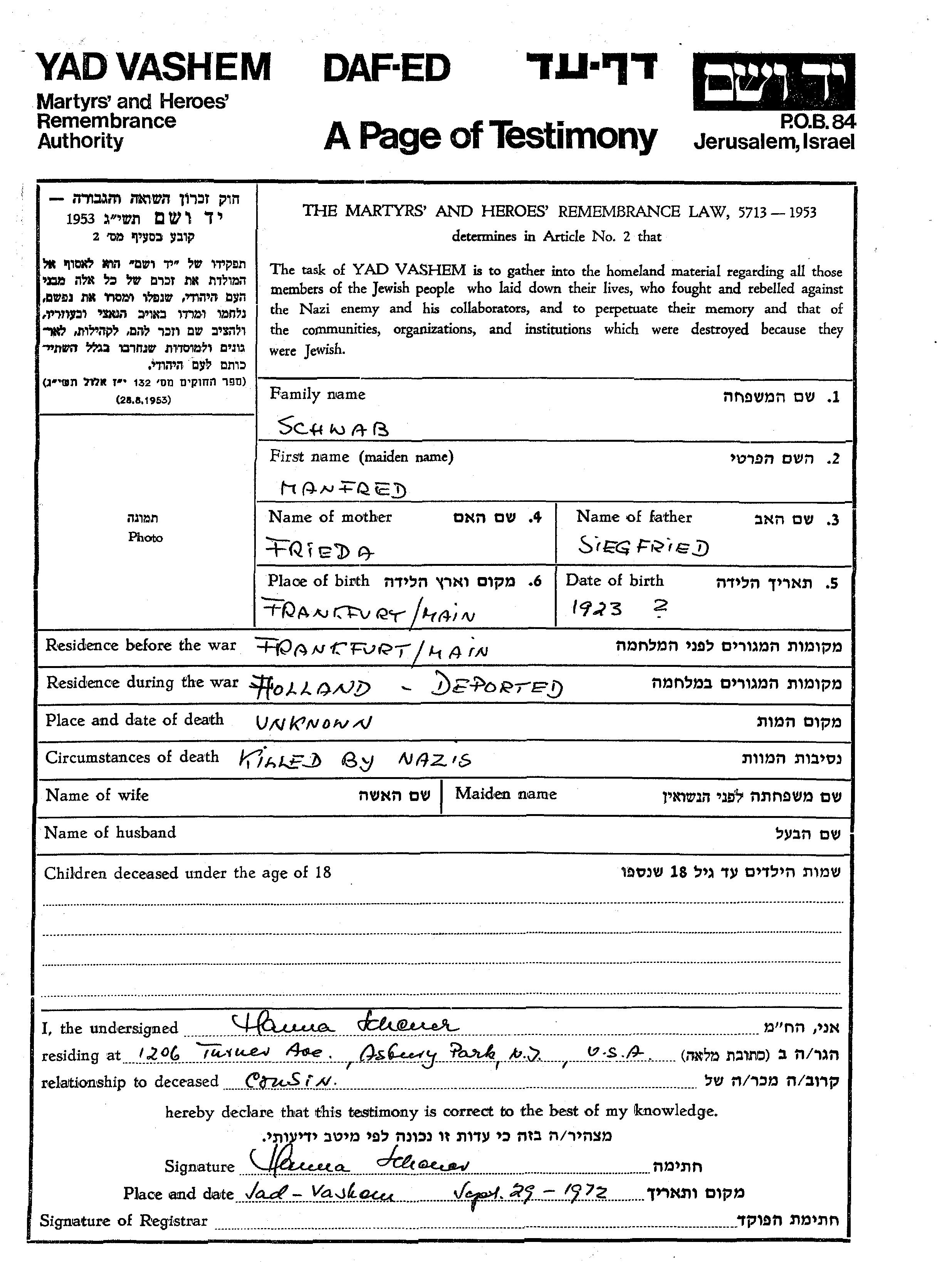 מנפרד Schwab נולד בFrankfort on the Main שבגרמניה בשנת 1923. לפני מלחמת העולם השניה התגורר בFrankfort on the Main שבגרמניה.