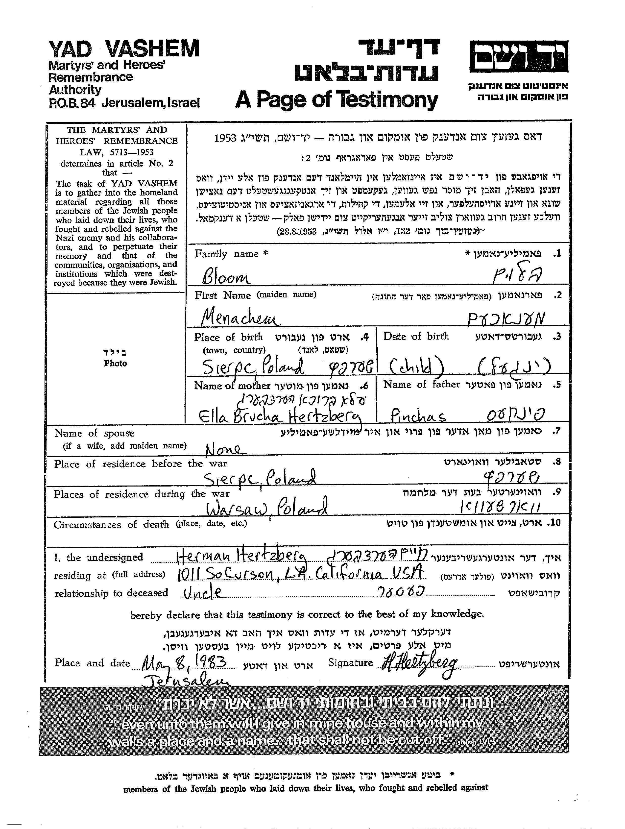 Menachem Bloom נולד בSierpc שבפולין לPinchas ואלה Brucha. לפני מלחמת העולם השניה התגורר בSierpc שבפולין. בזמן המלחמה הוא היה בWarszawa שבפולין.
