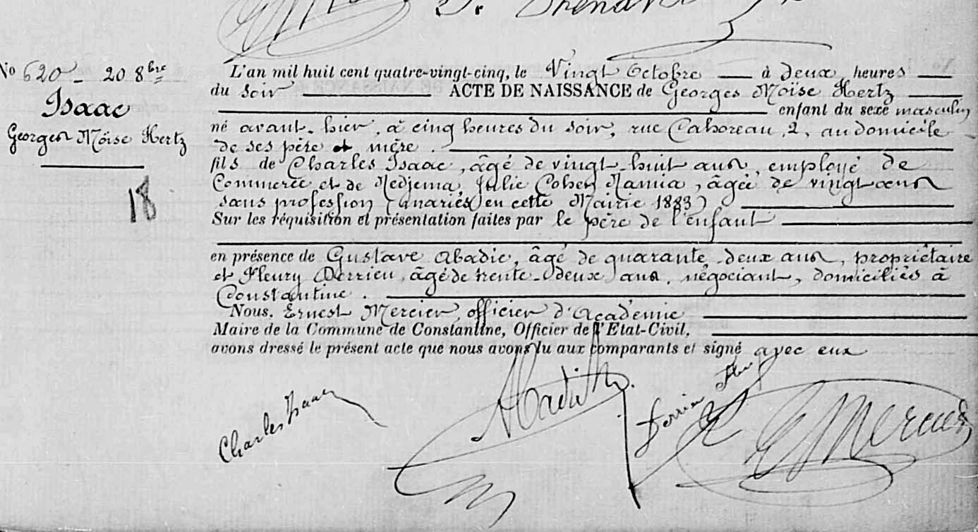 | Isaac | Georges Moïse Hertz | 1885 | מקום לא רשום, | תעודת לידה |