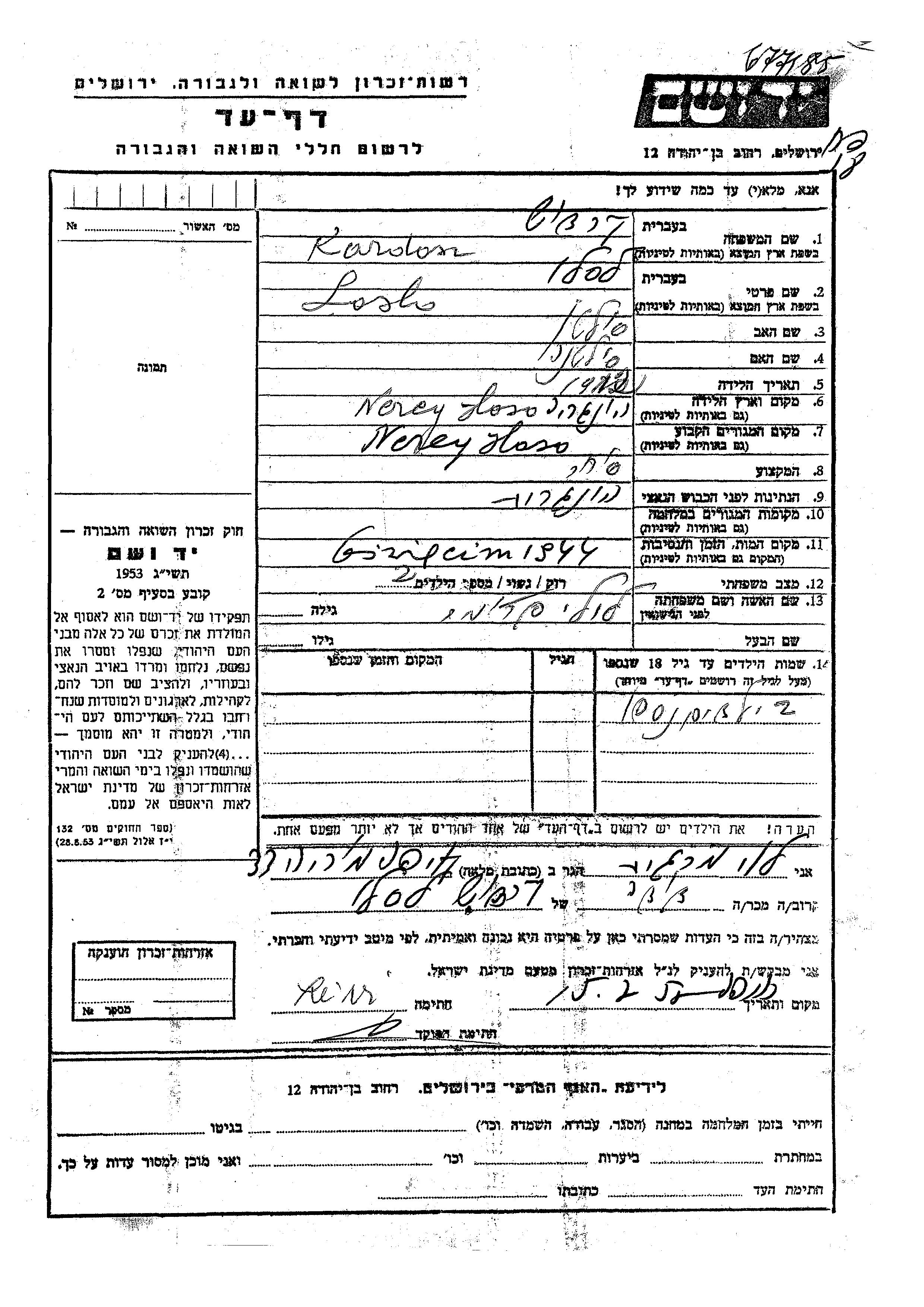 לסלו Kardos נולד בNyiregyhaza שבהונגריה בשנת 1912 לזולטן וסולטנה. הוא היה סוחר ונשוי ללילי פרימת. לפני מלחמת העולם השניה התגורר בNyiregyhaza שבהונגריה. לסלו נרצח בשואה. מקום המוות: Auschwitz שבפולין בשנת 1944.