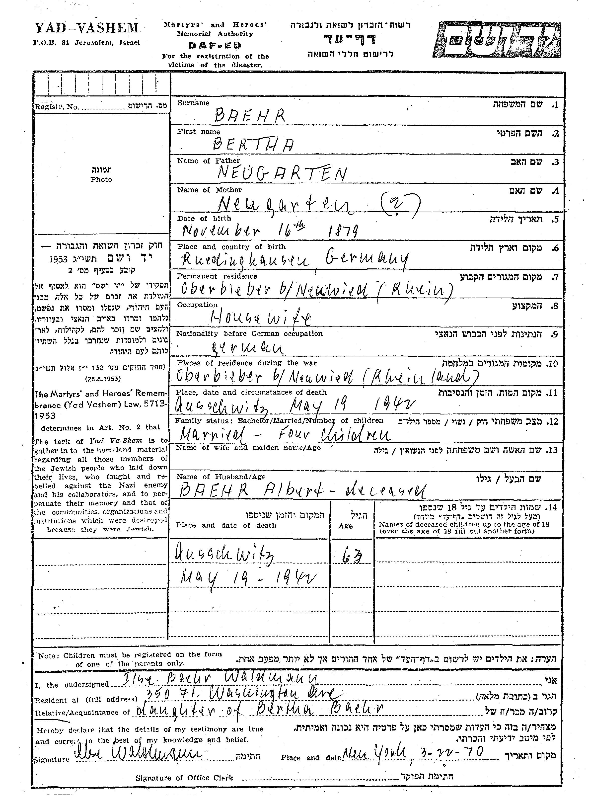Bertha Baehr לבית Neugarten נולדה בRuedinghausen שבגרמניה בשנת 1879. היא היתה עקרת בית ונשואה לאלברט. לפני מלחמת העולם השניה התגוררה בOberbieber שבגרמניה. בזמן המלחמה היא היתה בOberbieber שבגרמניה. היא נרצחה בשואה. מקום המוות: Auschwitz שבפולין בשנת 19/05/1942.