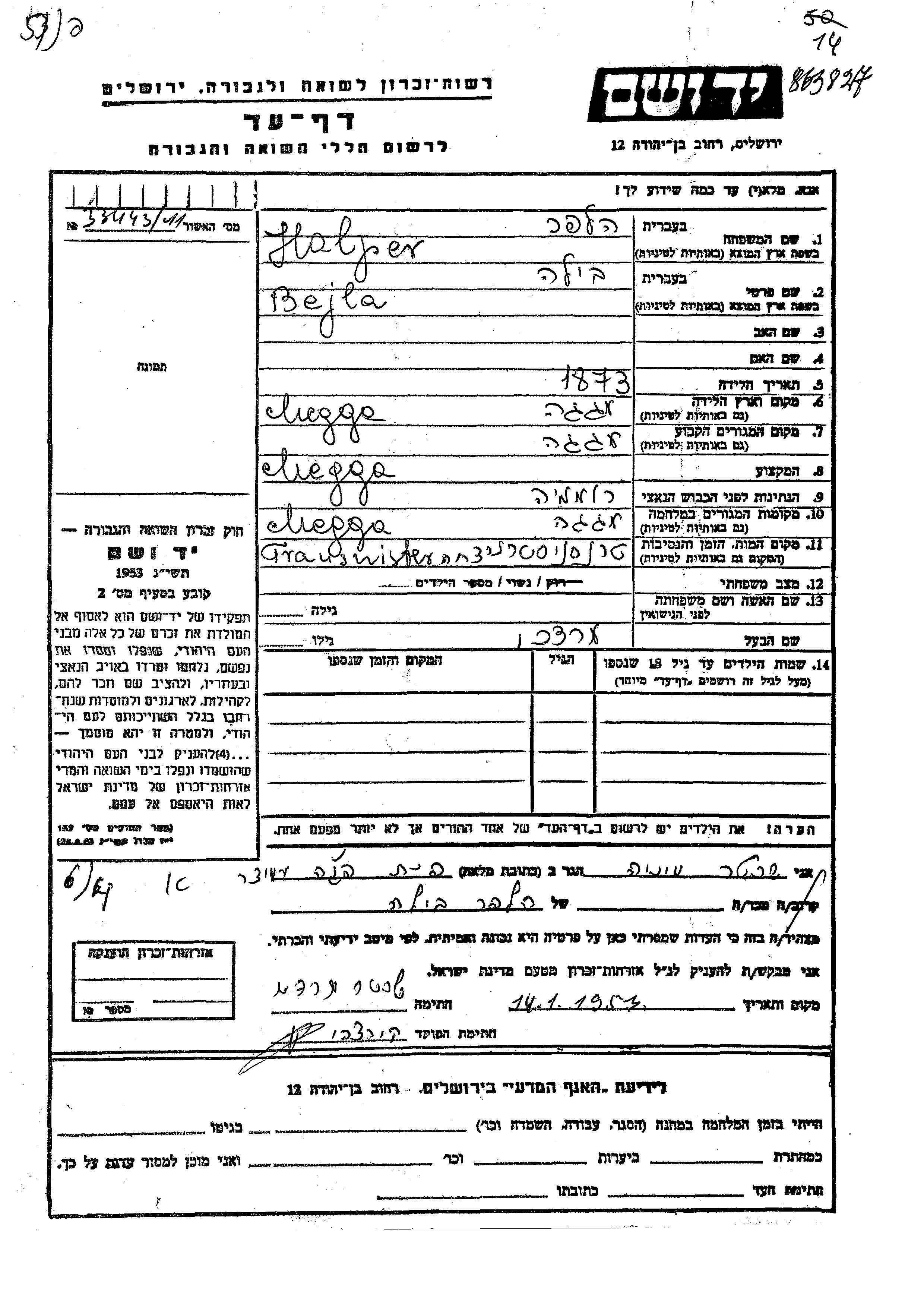 Bejla הלפר נולדה בMega שברומניה בשנת 1873. היא היתה נשואה למרדכי. לפני מלחמת העולם השניה התגוררה בMega שברומניה. בזמן המלחמה היא היתה בMega שברומניה.