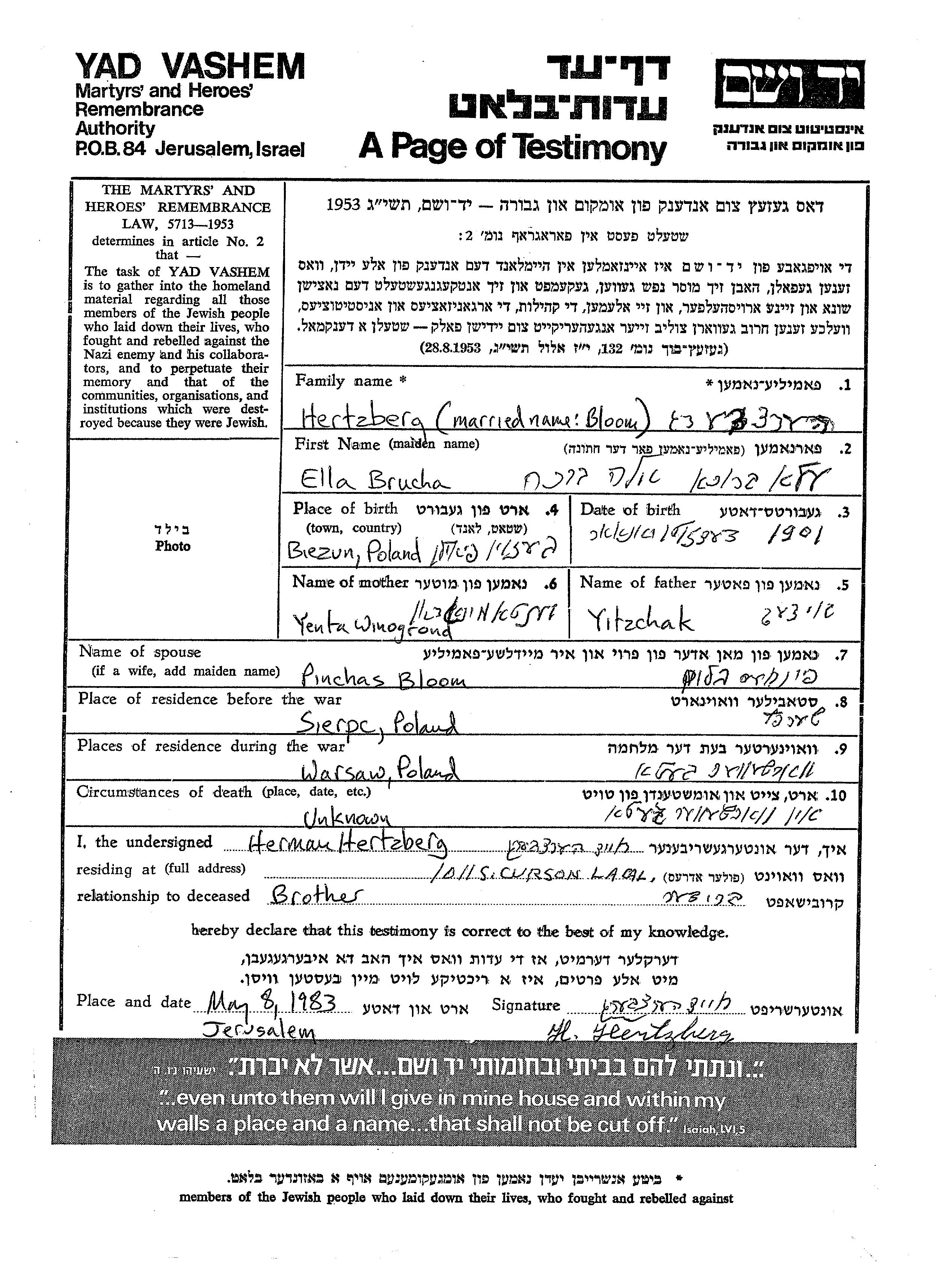 אלה Brucha Bloom לבית הרצברג נולדה בBiezun שבפולין בשנת 1901 לYitzchak ויענטא. היא היתה נשואה לPinchas. לפני מלחמת העולם השניה התגוררה בSierpc שבפולין. בזמן המלחמה היא היתה בWarszawa שבפולין.