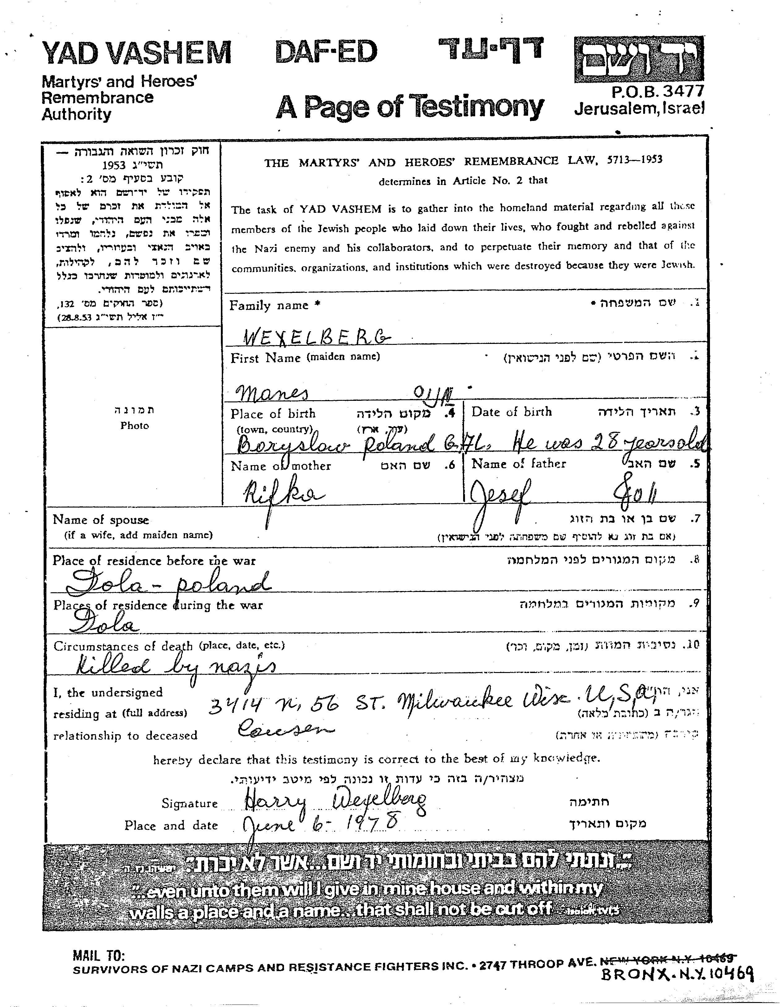 מנס מניס Wexelberg נולד בBoryslaw שבפולין לJeseph וריפקה. לפני מלחמת העולם השניה התגורר בDala שבצ'כוסלובקיה. בזמן המלחמה הוא היה בDala שבצ'כוסלובקיה.