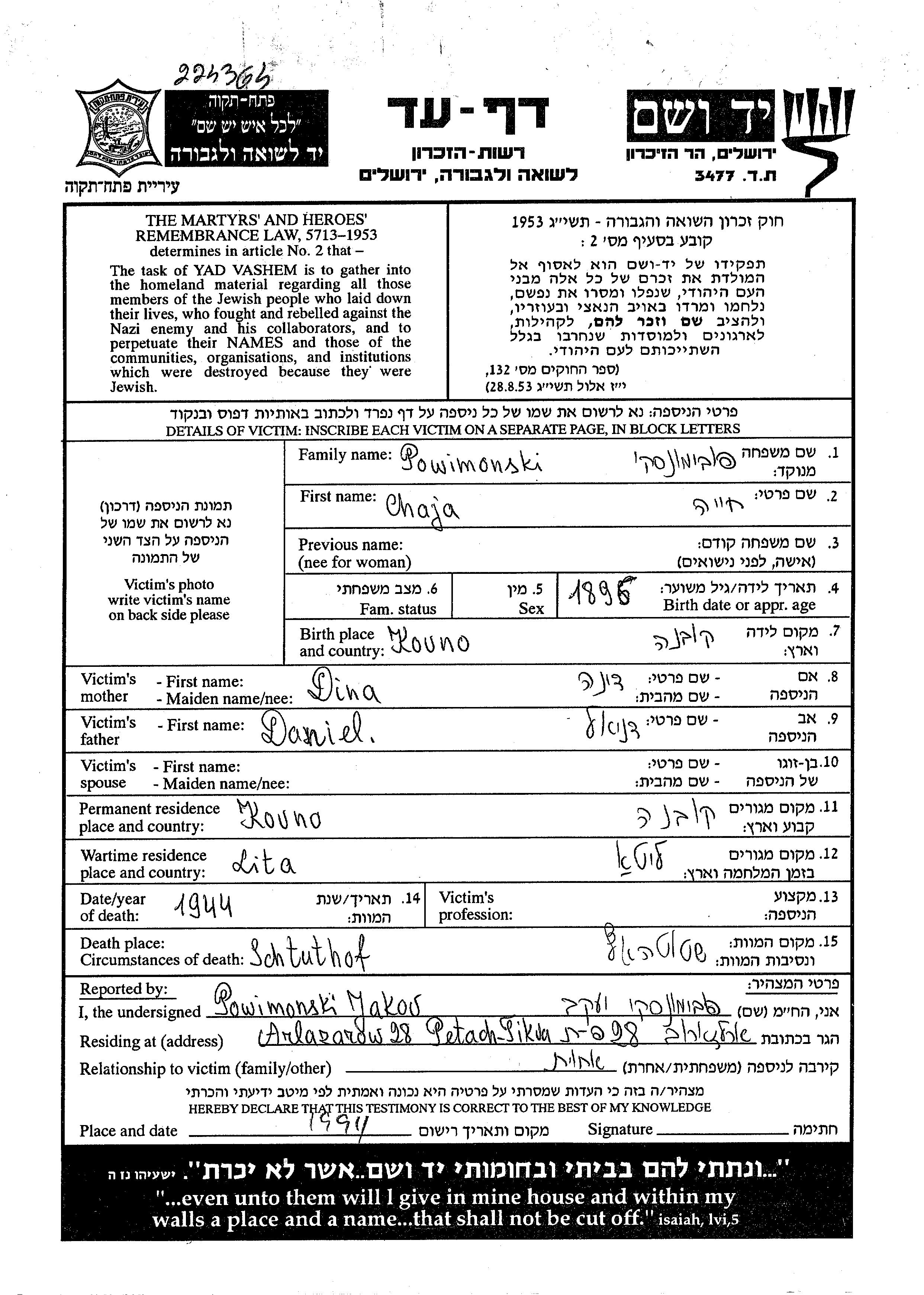 Chaja פובימונסקי נולדה בKowno שבליטא בשנת 1896 לדניאל ודינה. לפני מלחמת העולם השניה התגוררה בKowno שבליטא. בזמן המלחמה היא היתה בליטא. היא נרצחה בשואה. מקום המוות: Stutthof שבדנציג בשנת 1944.