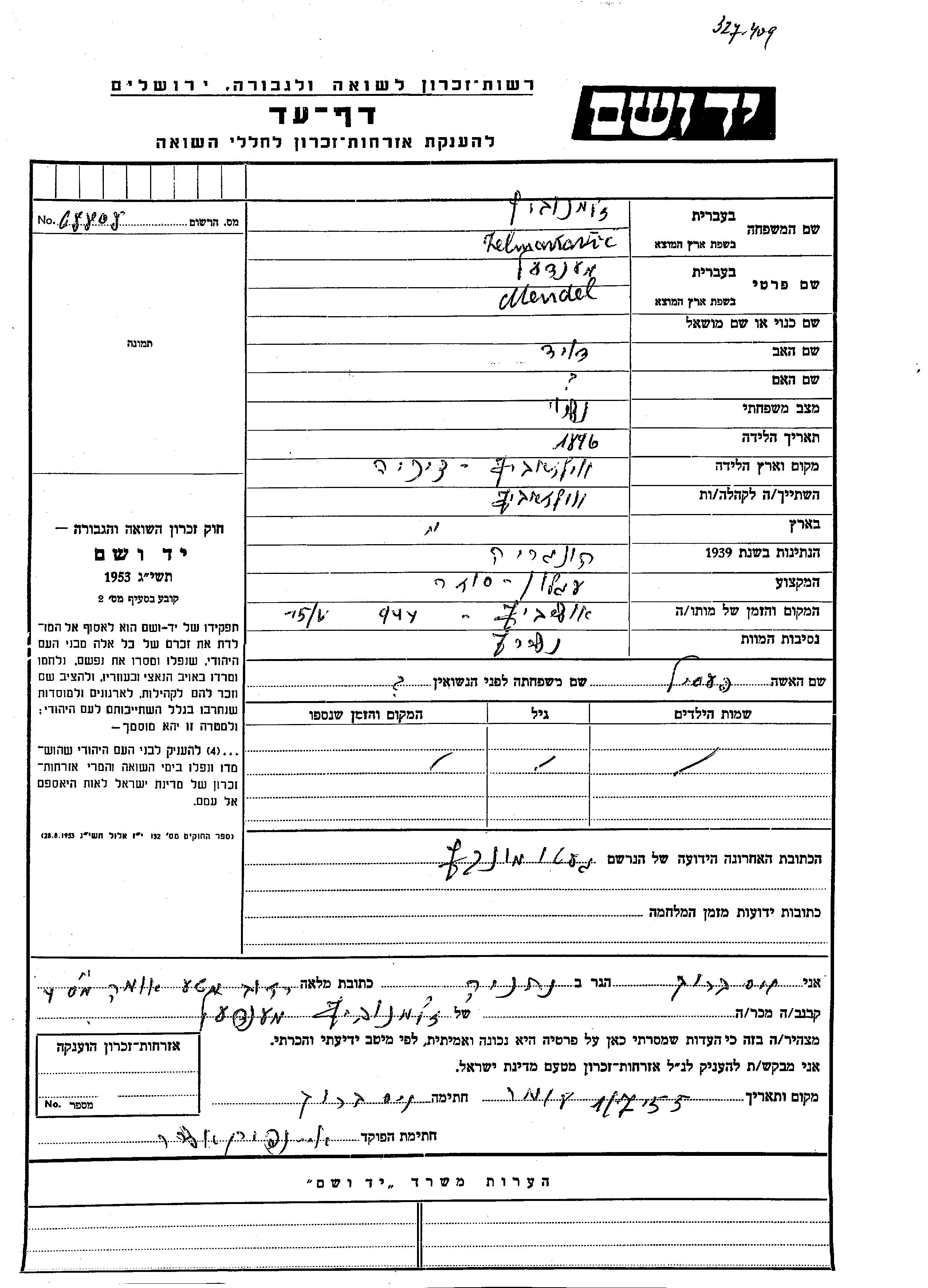 מנדל נרצח בשואה. מקום המוות: Auschwitz שבפולין בשנת 1944.