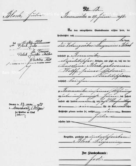 Julie פולק לבית Bloch נולדה בRosenwiller שבצרפת בשנת 1896. לפני מלחמת העולם השניה התגוררה בSaverne שבצרפת.