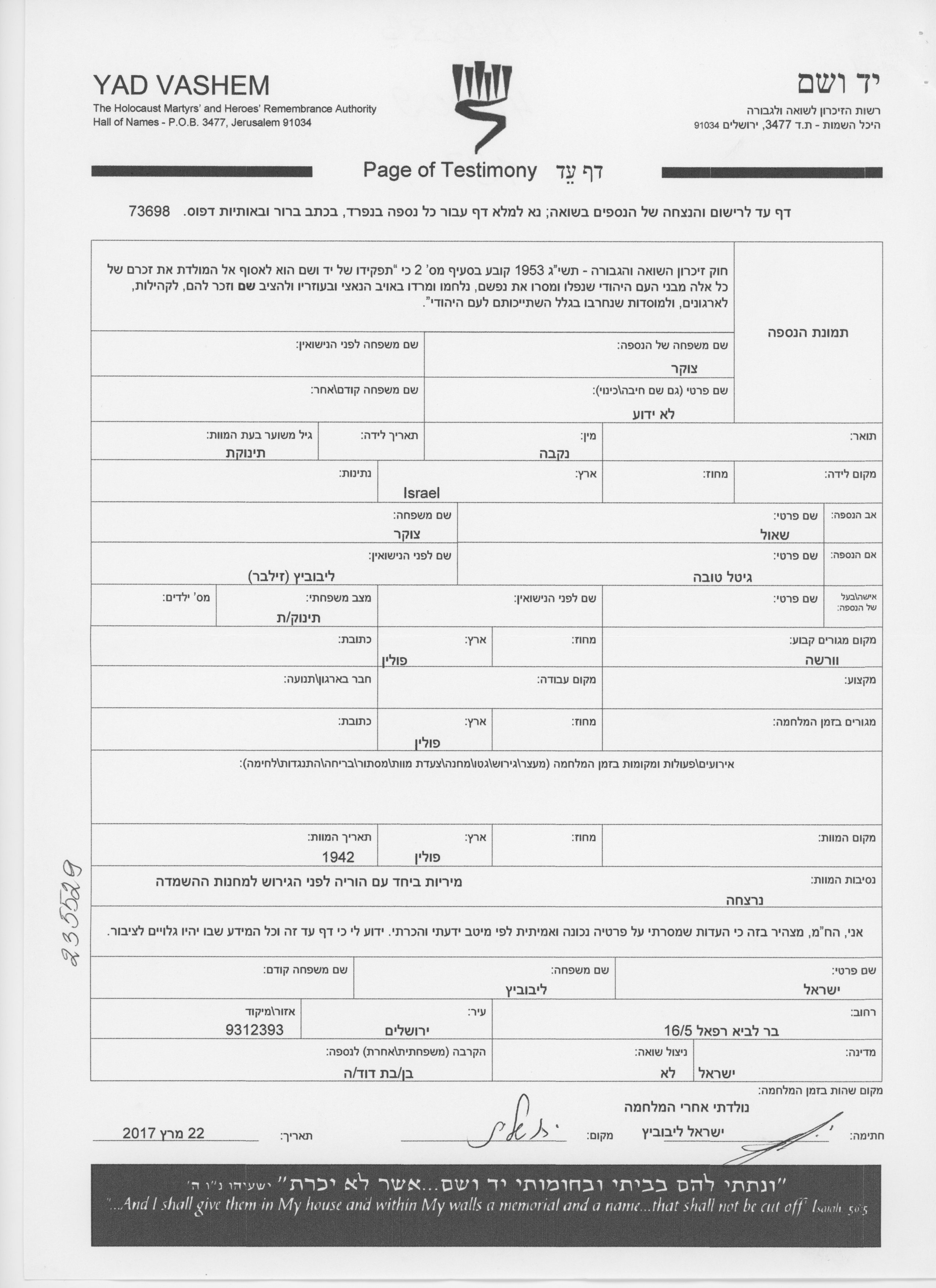 שם פרטי לא ידוע צוקר. לפני מלחמת העולם השניה התגוררה בWarszawa שבפולין.
