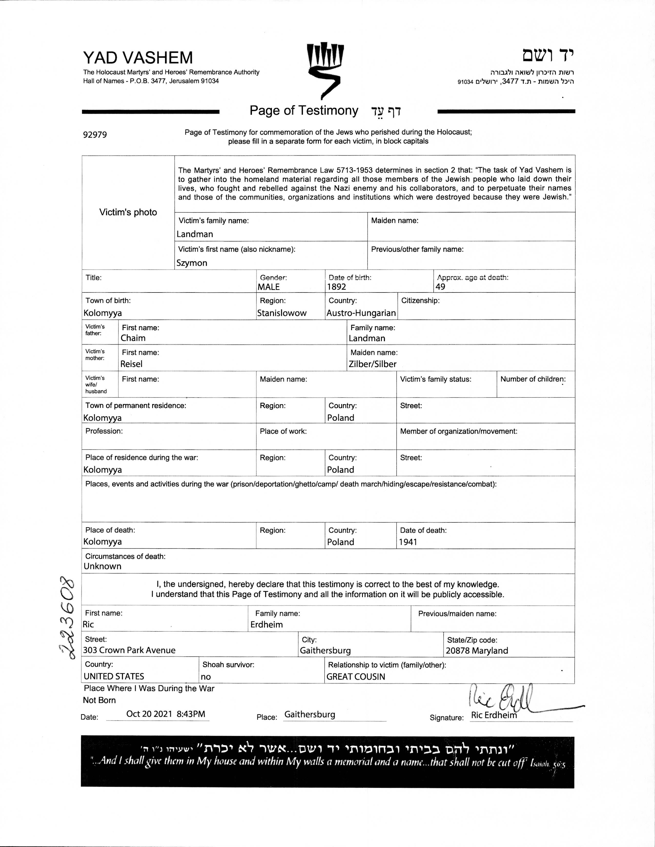 Szymon Landman נולד בKolomyja שבפולין בשנת 1892 לChaim וReisel לבית Zilber. לפני מלחמת העולם השניה התגורר בKolomyja שבפולין. בזמן המלחמה הוא היה בKolomyja שבפולין. הוא נרצח בשואה. מקום המוות: Kolomyja שבפולין בשנת 1941.