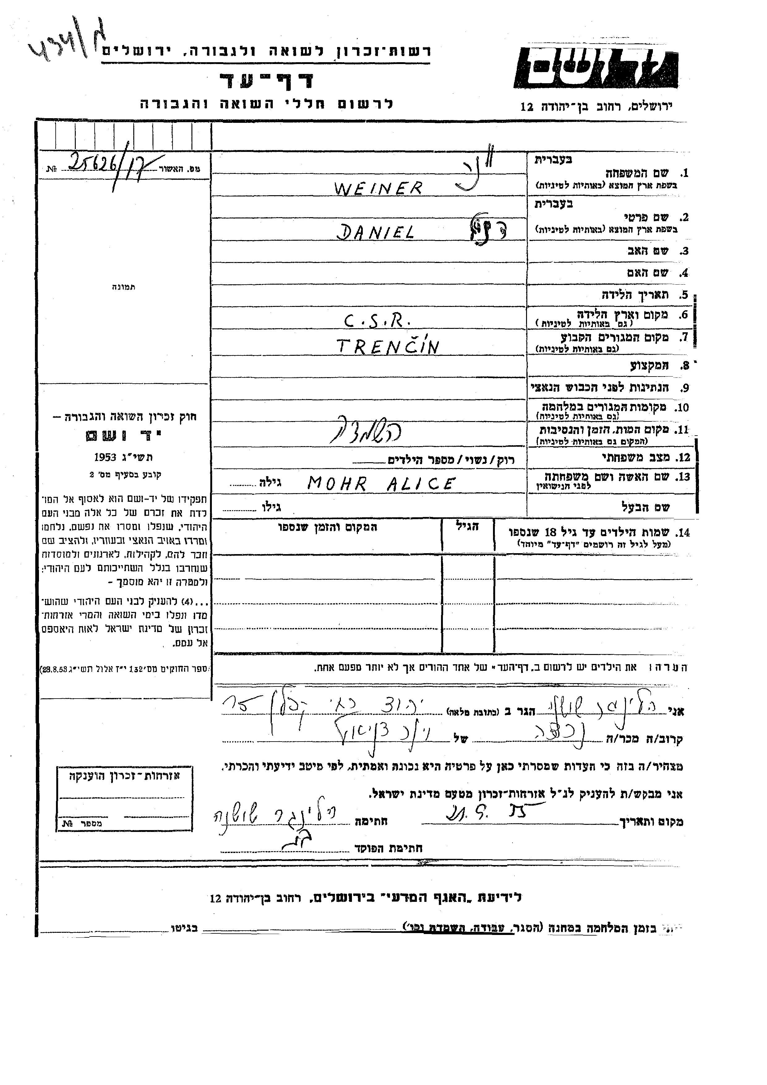 Weiner וונר דניאל Trencin, צ'כוסלובקיה דף-עד