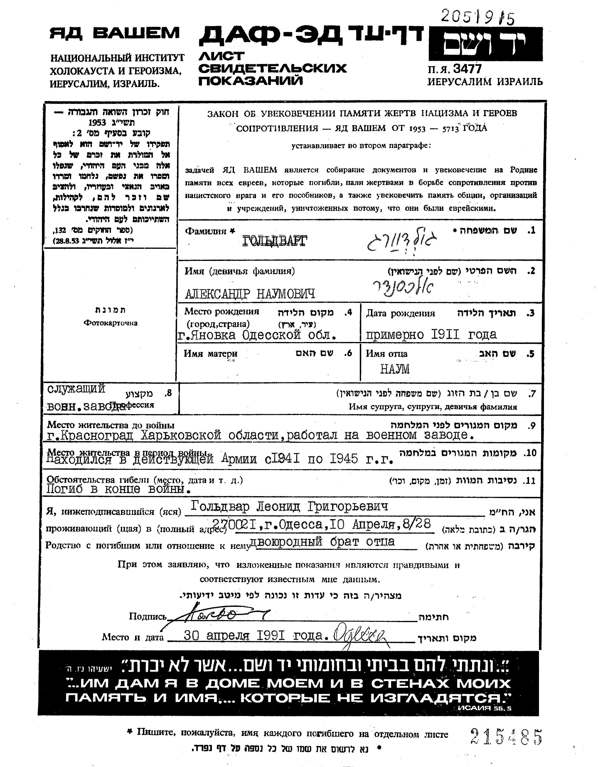 אלכסנדר גולדוורג נולד בYanovka שבאוקראינה (ברה"מ) בשנת 1911. לפני מלחמת העולם השניה התגורר בKharkov שבאוקראינה (ברה"מ).