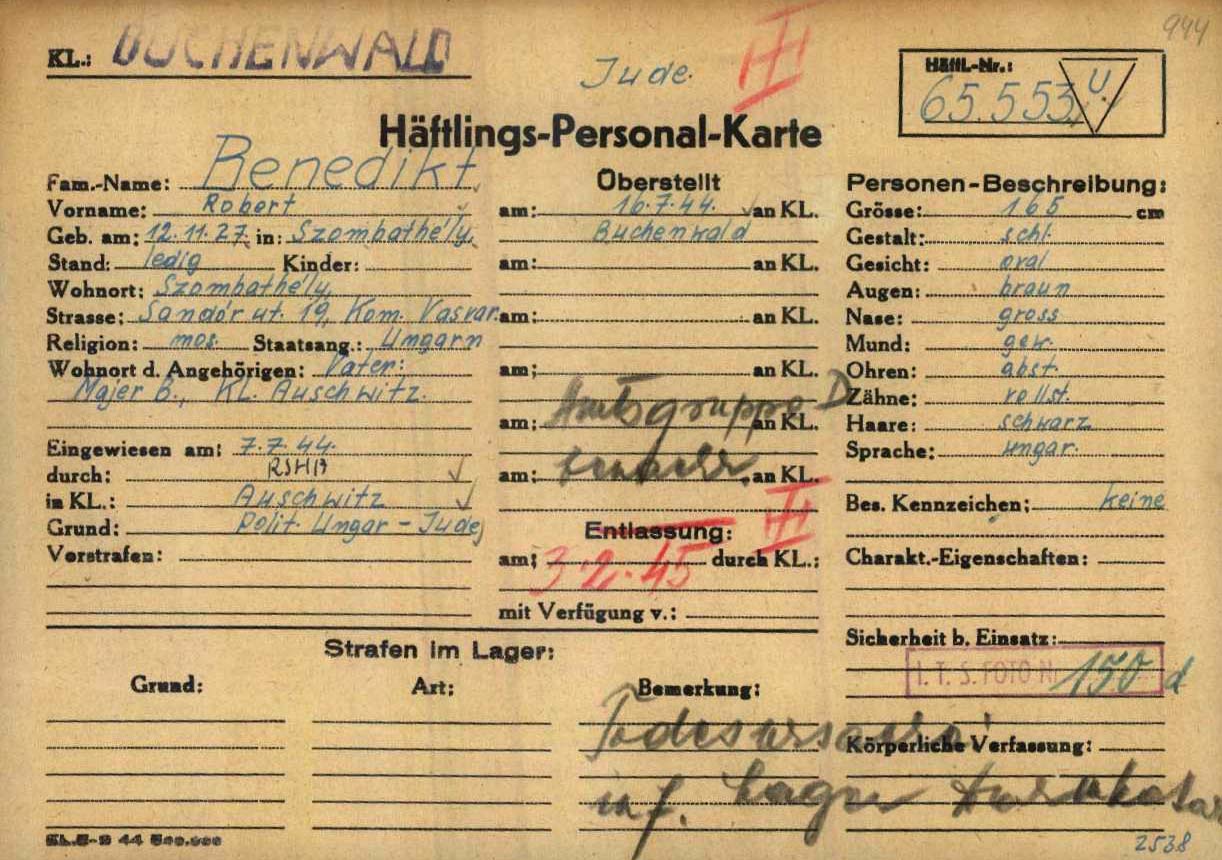 רוברט נרצח בשואה. מקום המוות: Buchenwald שבגרמניה בשנת 03/02/1945.