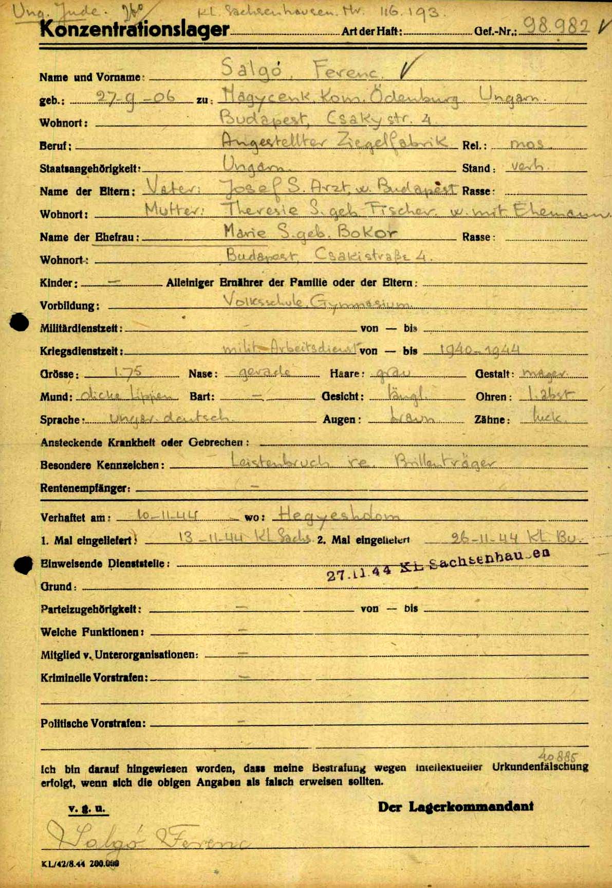 Ferenc סלגו נולד בNagycenk שבהונגריה בשנת 1906. לפני מלחמת העולם השניה התגורר בBudapest שבהונגריה.