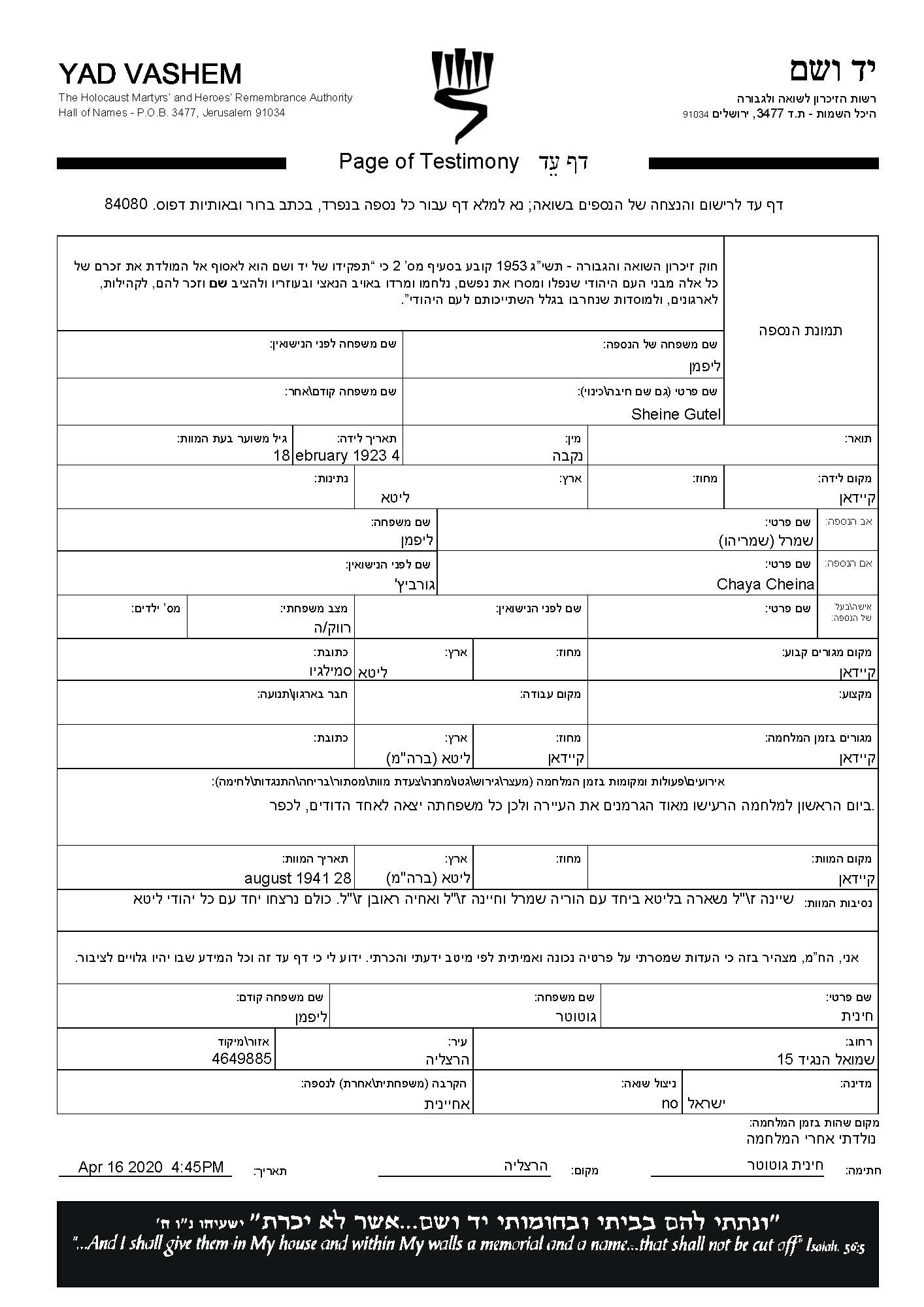 Sheine Gutel ליפמן נולדה בKeidani שבליטא בשנת 1923. לפני מלחמת העולם השניה התגוררה בKeidani שבליטא.