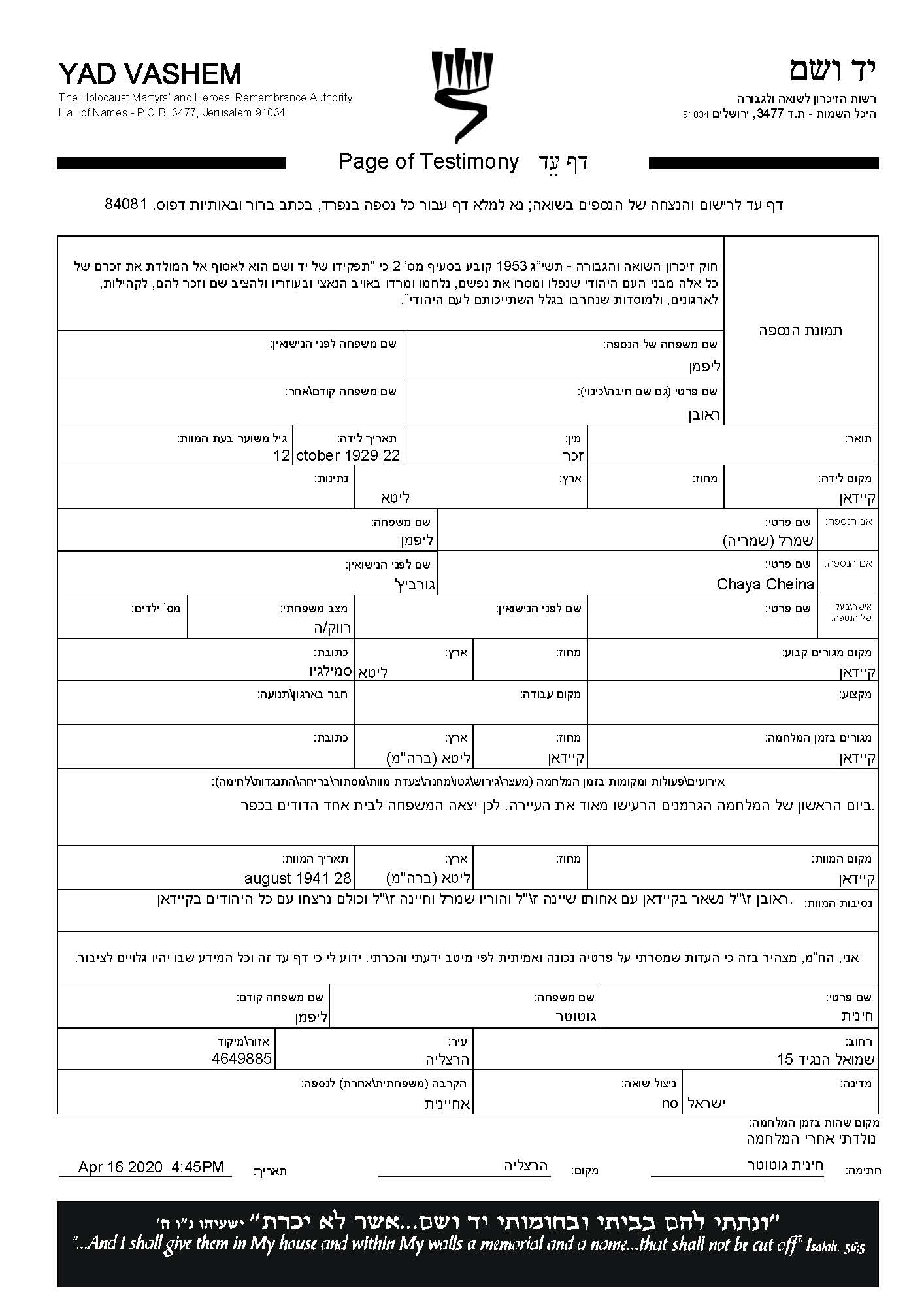 ראובן נרצח בשואה. מקום המוות: Keidani שבליטא בשנת 28/08/1941.