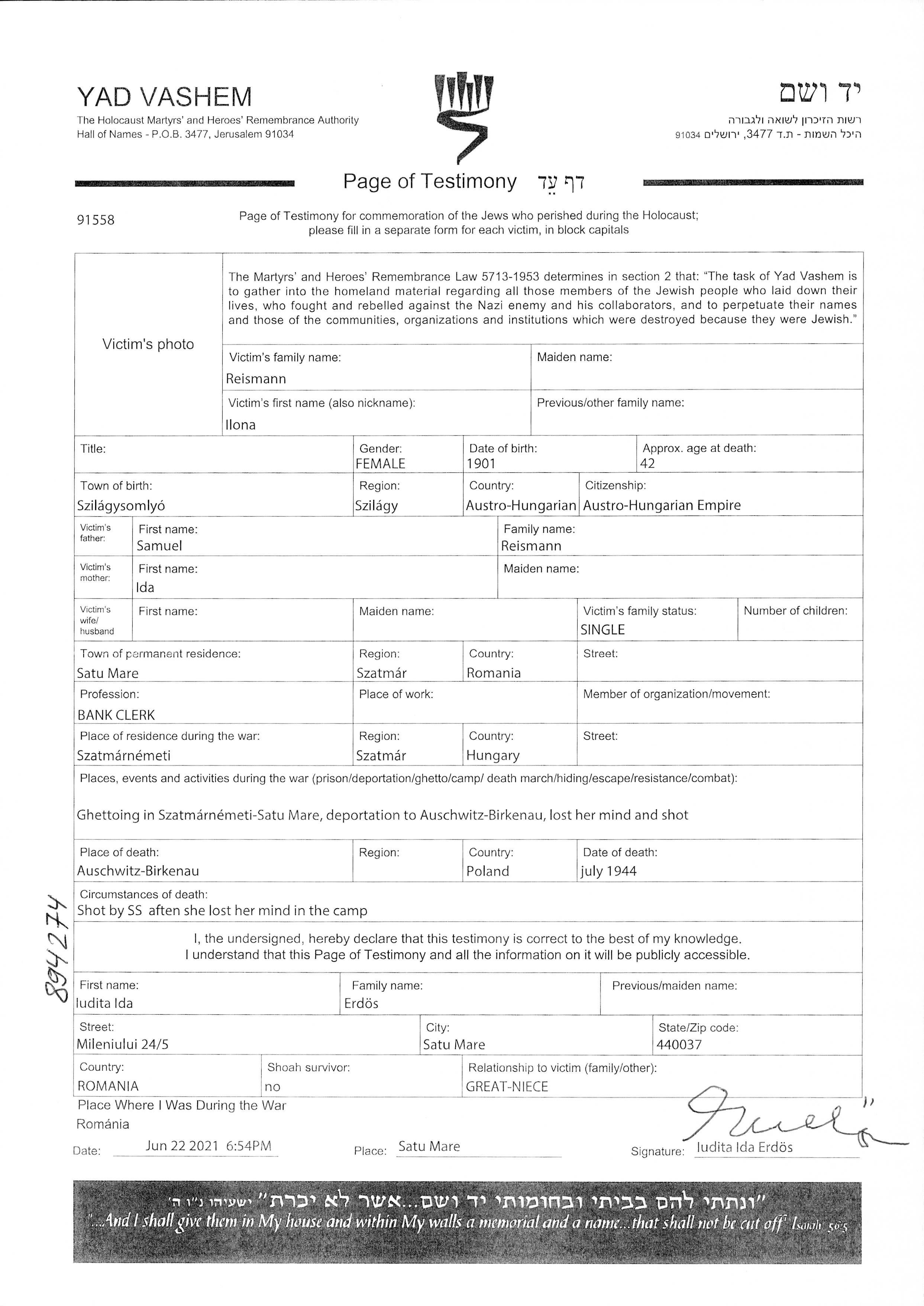 Reismann Ilona 1901 Satu Mare, רומניה דף-עד (מקוון חתום)