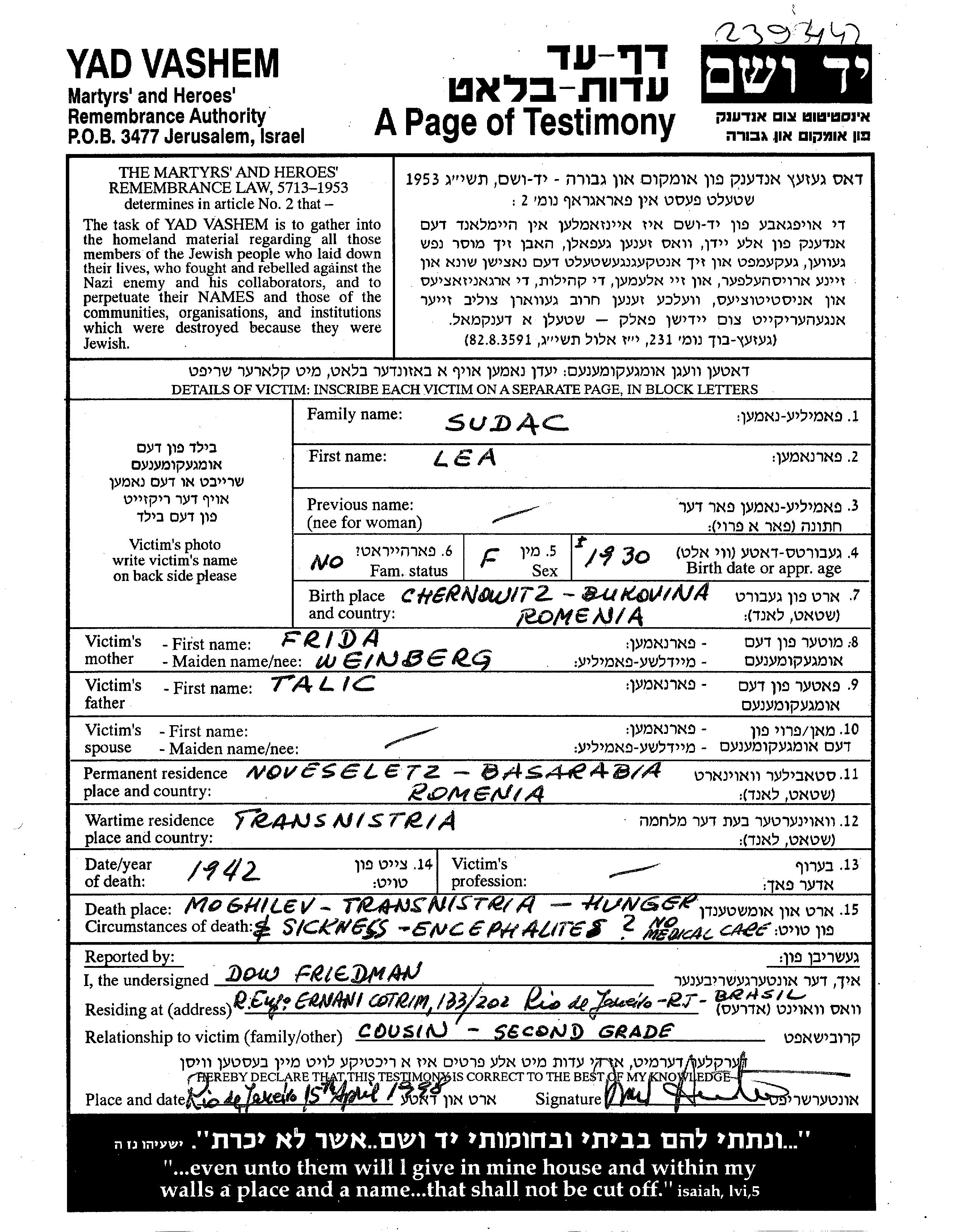 לאה Sudac נולדה בCzernowitz שברומניה בשנת 1930 לTalic טליק ופרידה לבית Weinberg. היא היתה ילדה. לפני מלחמת העולם השניה התגוררה בNovoselica שברומניה. בזמן המלחמה היא היתה בTransnistria שבאוקראינה (ברה"מ).