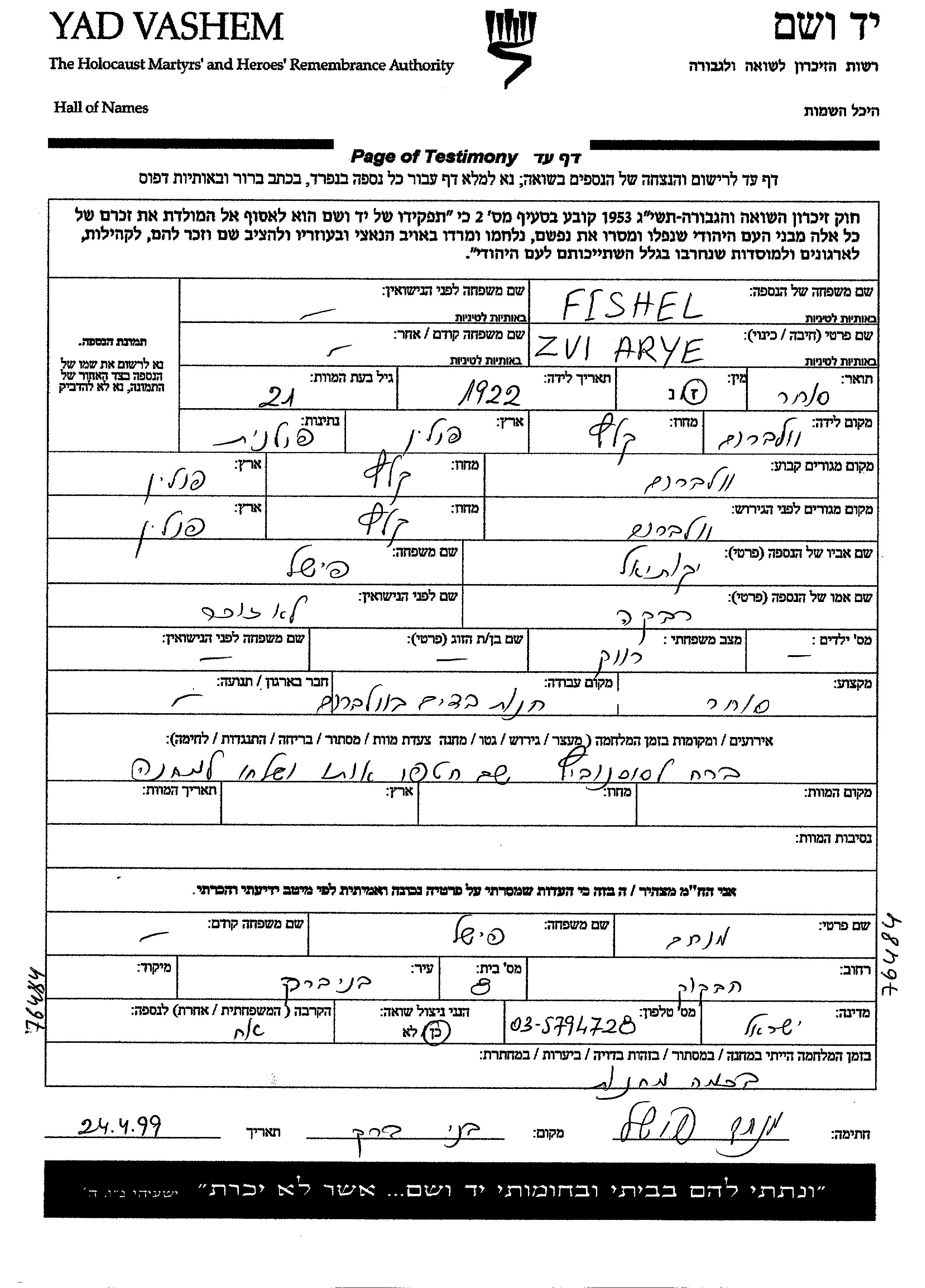 פישל Zvi Arye 1922 Wolbrum, פולין דף-עד