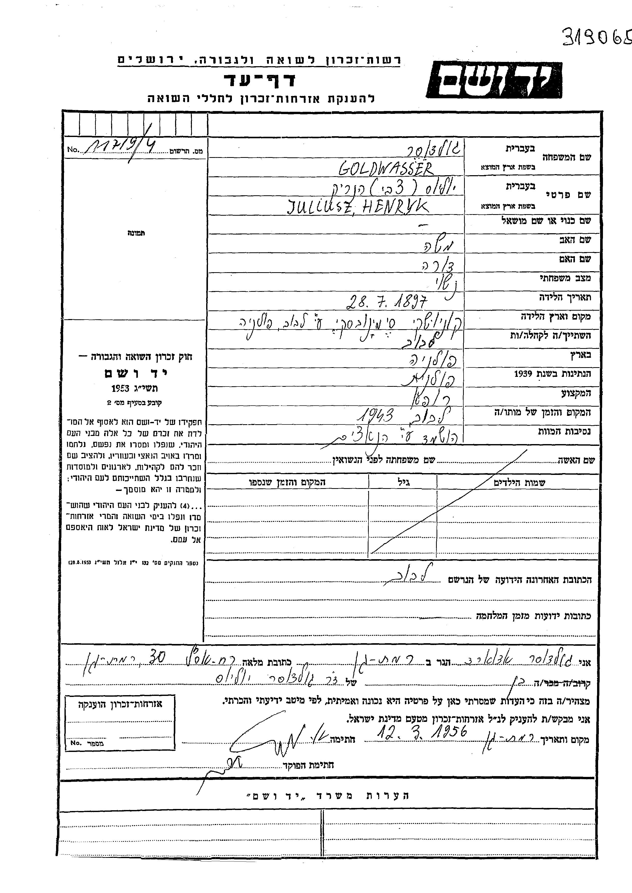 Goldwasser Juliusz Henryk צבי 1897 Lwow, פולין דף-עד