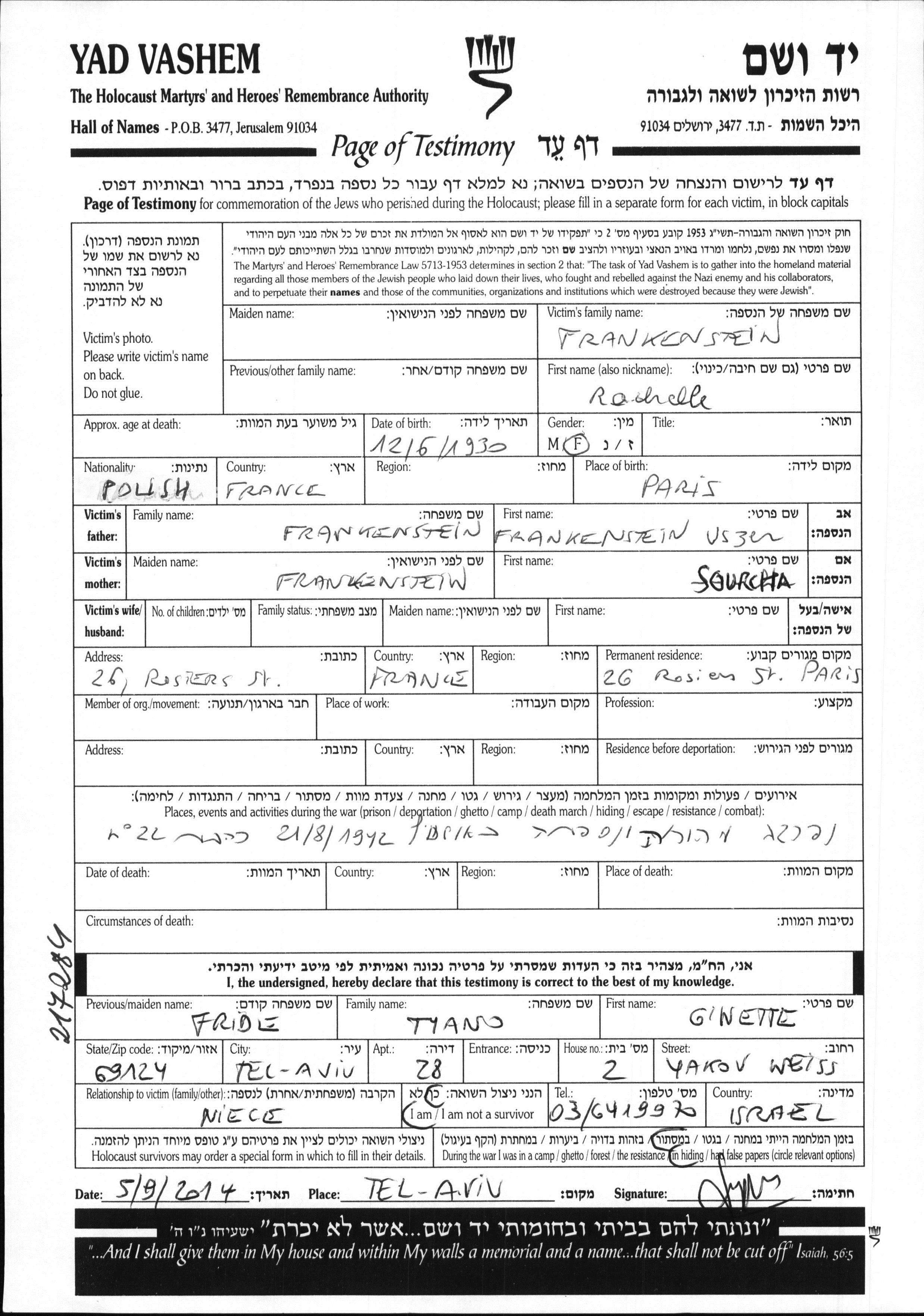 Frankensztejn רחל 1930 Paris, צרפת רשימת גירוש מצרפת