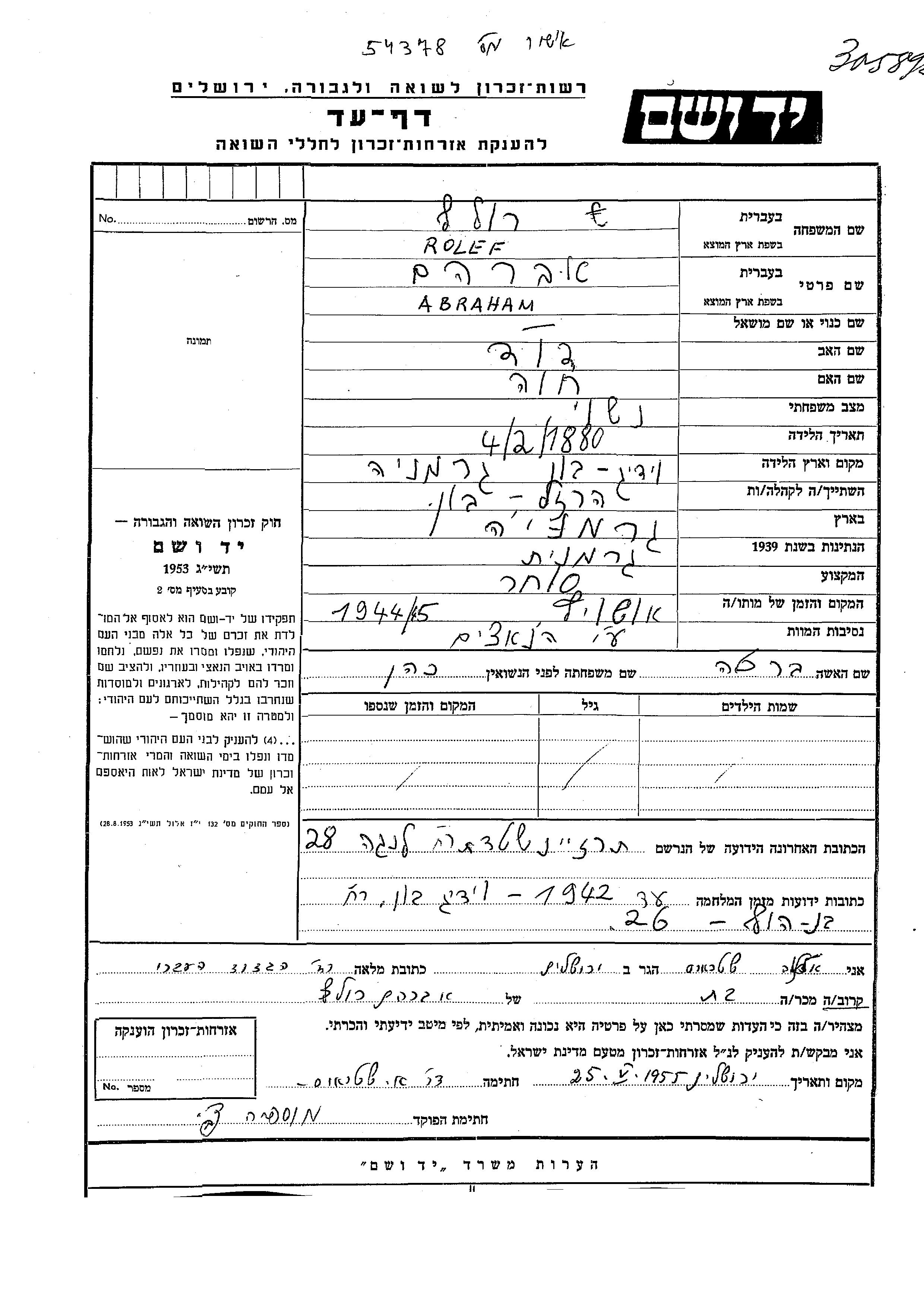 Abraham רולף נולד בWiddig שבגרמניה בשנת 1880 לדוד וחוה. הוא היה סוחר. לפני מלחמת העולם השניה התגורר בHersel שבגרמניה. בזמן המלחמה הוא היה בWiddig שבגרמניה. הוא נרצח בשואה. מקום המוות: Auschwitz שבפולין בשנת 1944.
