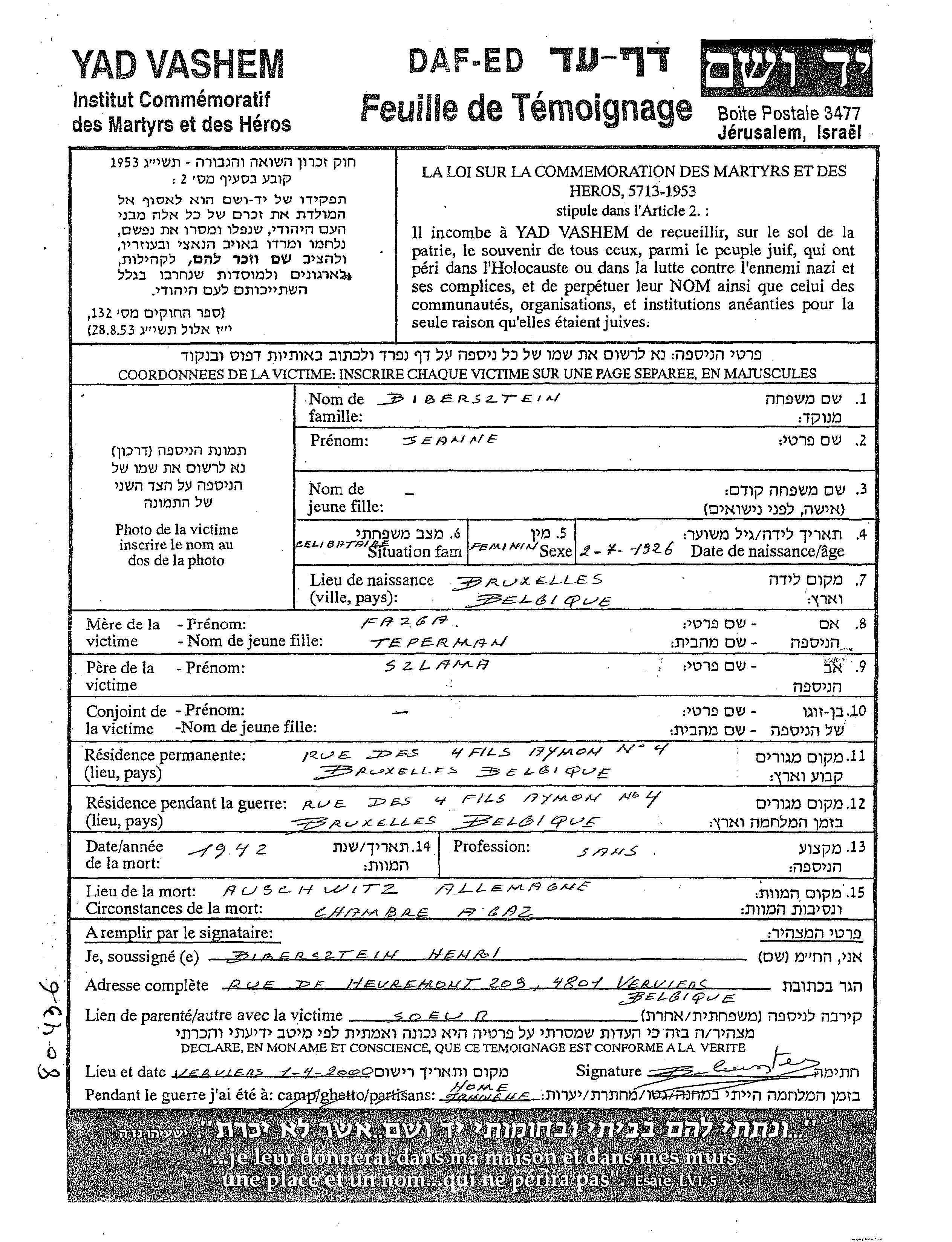 Jeanne Bibersztein נולדה בBruxelles שבבלגיה בשנת 1926. היא היתה ללא מקצוע. לפני מלחמת העולם השניה התגוררה בBruxelles שבבלגיה.