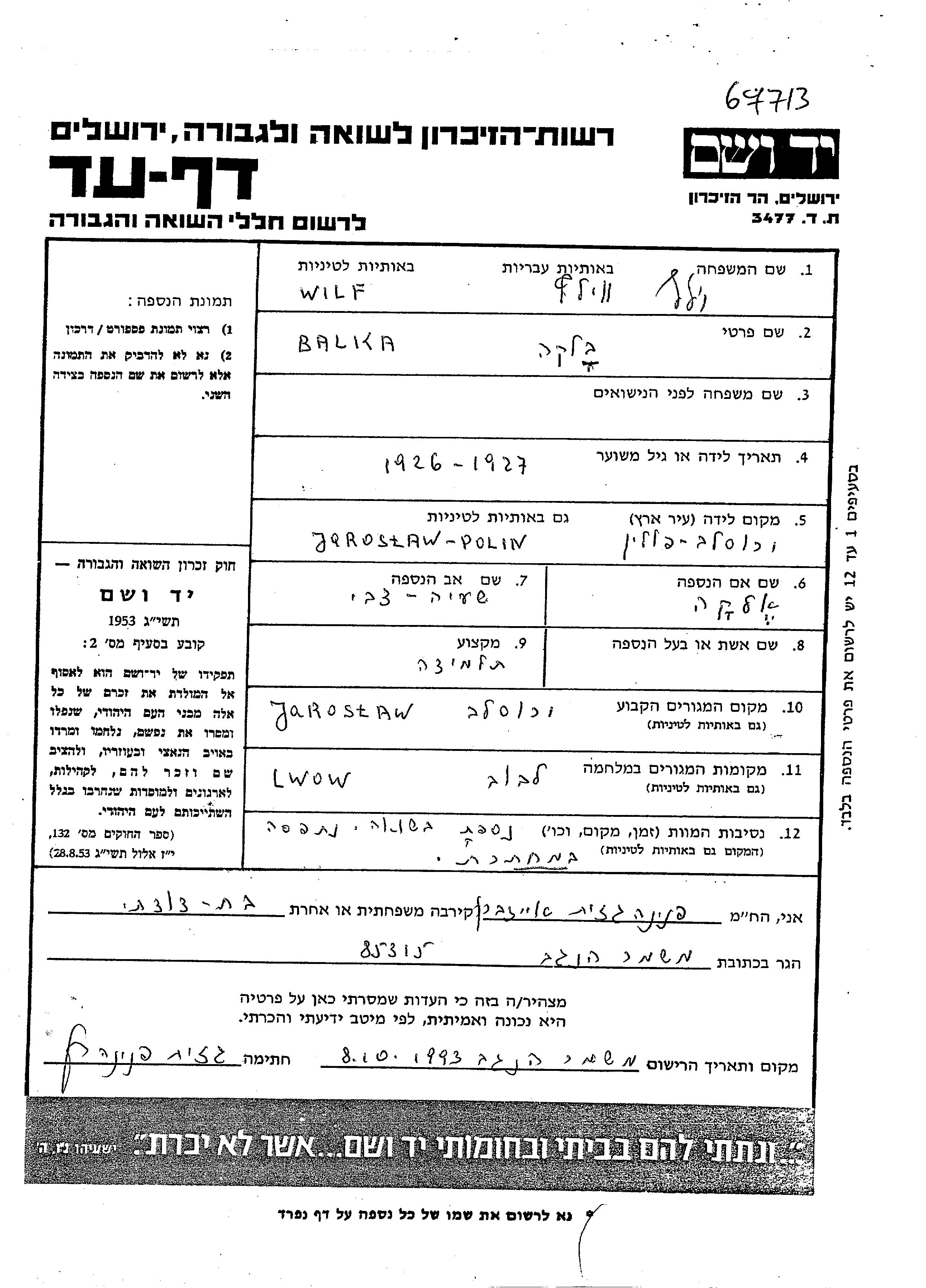 וילף בלה Jaroslaw, פולין רשימת יהודים נרצחים מתוך ספרי יזכור