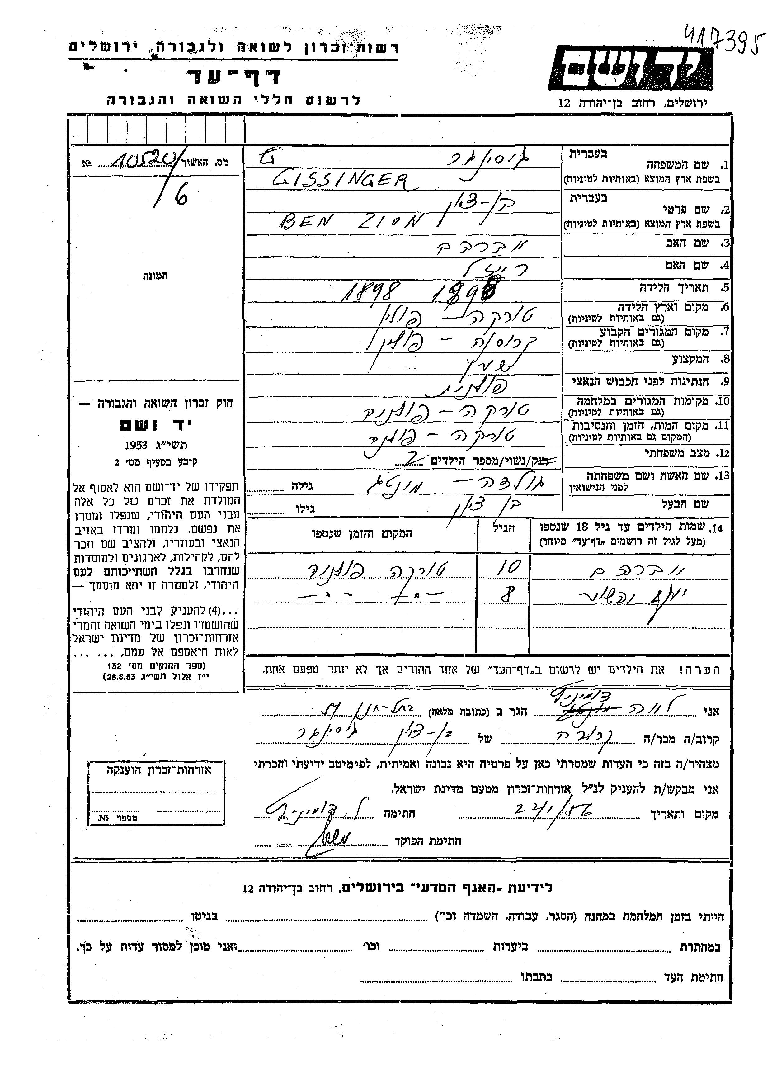 Ben Cyjon Gissinger נולד בTorek שבפולין בשנת 1896. הוא היה שען. לפני מלחמת העולם השניה התגורר בKrosno שבפולין.