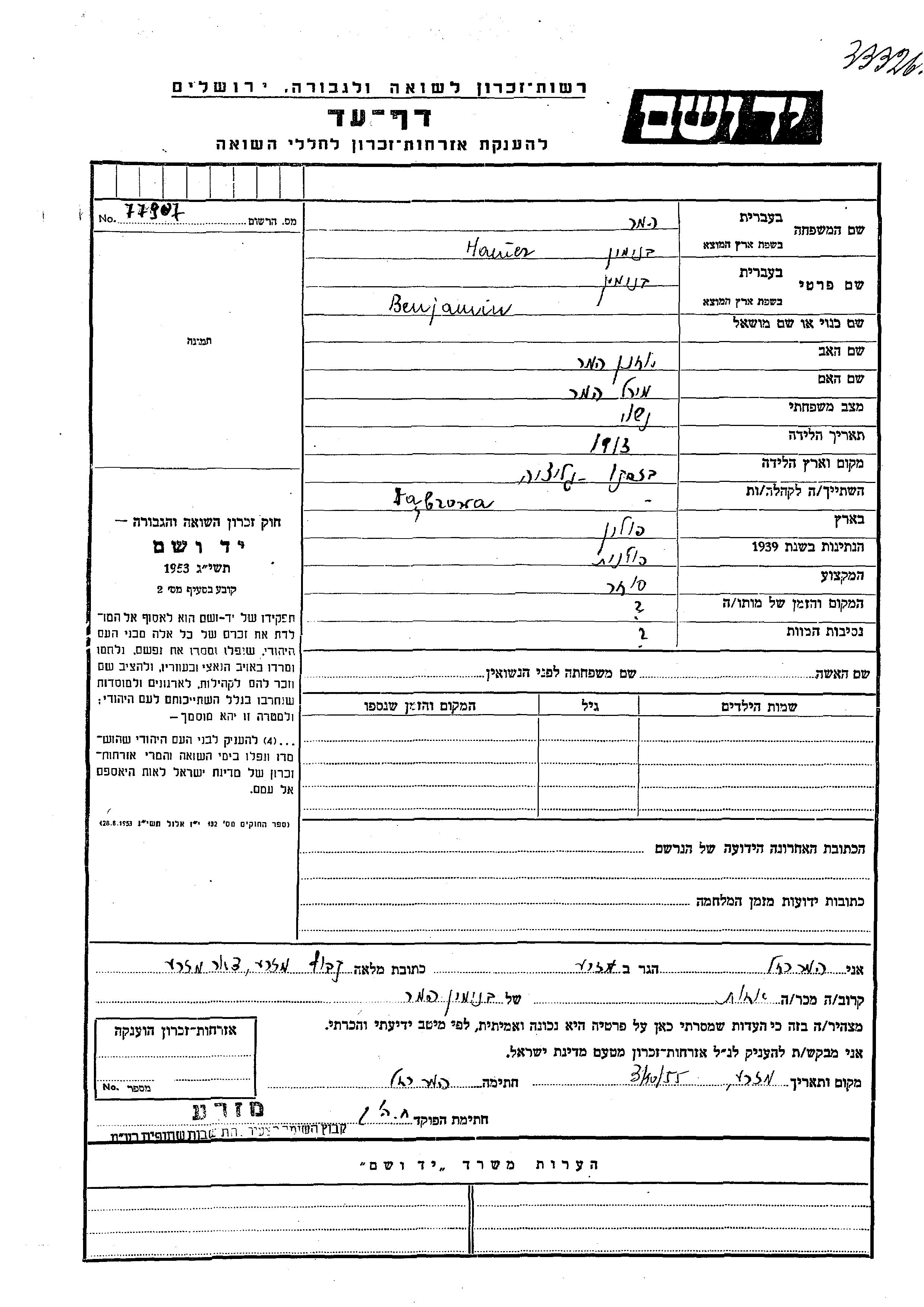 בנימין נרצח בשואה. מקום המוות: מקום לא רשום.